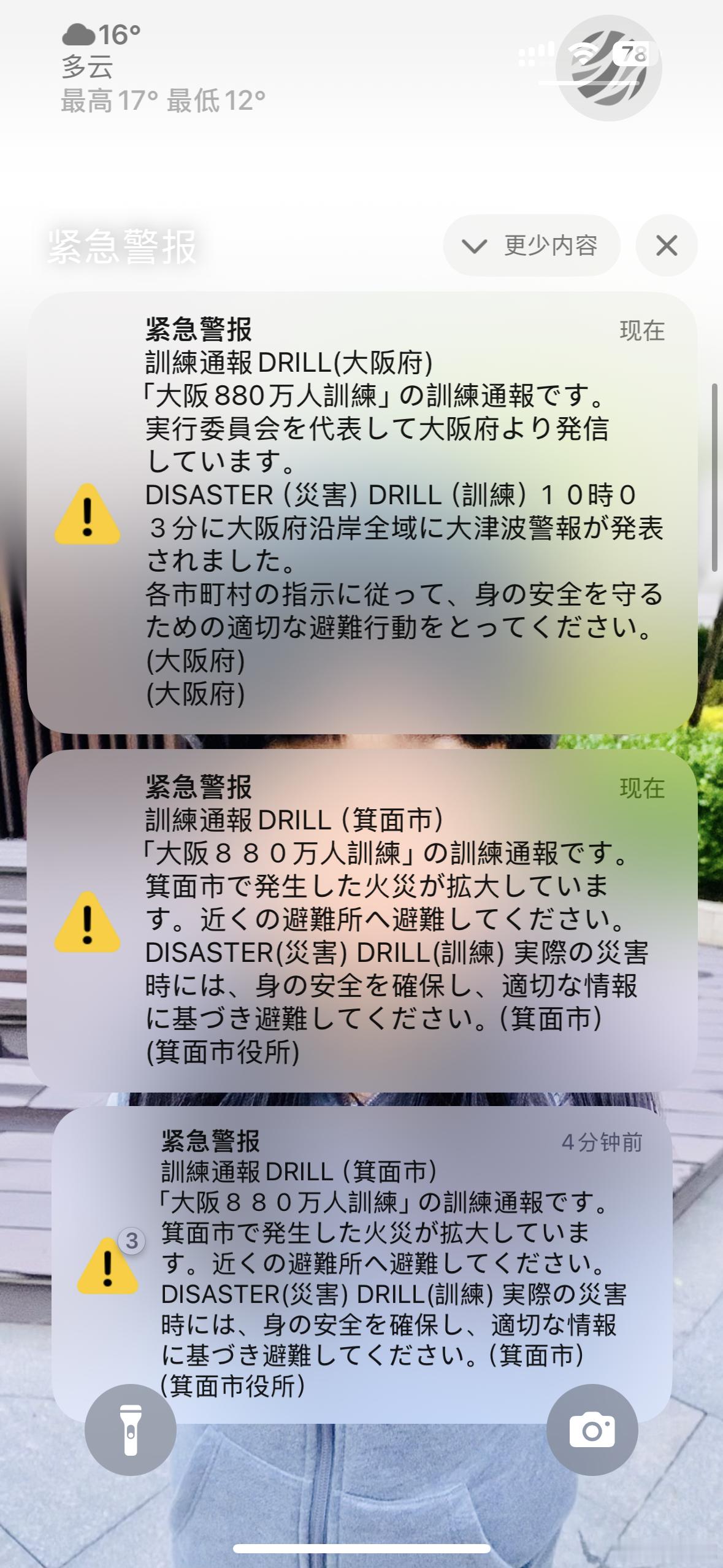 早上全大阪的手机一起响了,不分iPhone和安卓,不是app,是系统直接推送紧急警报,声音巨吵。内容是模拟地震、火灾、海啸等多种灾害,提醒大家按指示避难。这种全域级的灾害预警真的值得推广。如果在灾难来临时,比如上游泄洪、暴雨、山洪,每个人的手机都能立刻收到警告,能救下的生命和财产一定是无法估量的。