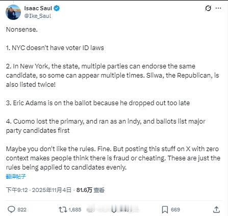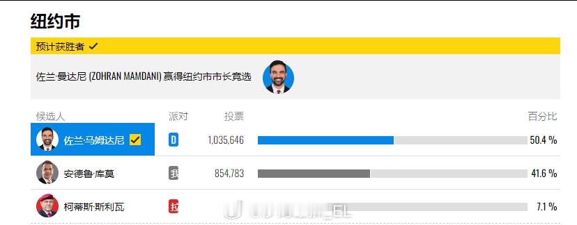 争议较大的左派候选人佐兰·马姆达尼以较大优势赢得了纽约市长选举,目前特朗普、马斯克和以色列方面(因为他亲巴勒斯坦)对此事非常不满。其中最小丑的是马斯克,在社交媒体上疯狂胡搅蛮缠,充分发扬了输不起就耍赖的美国民主政治精神,结果还被网友当场教育了。