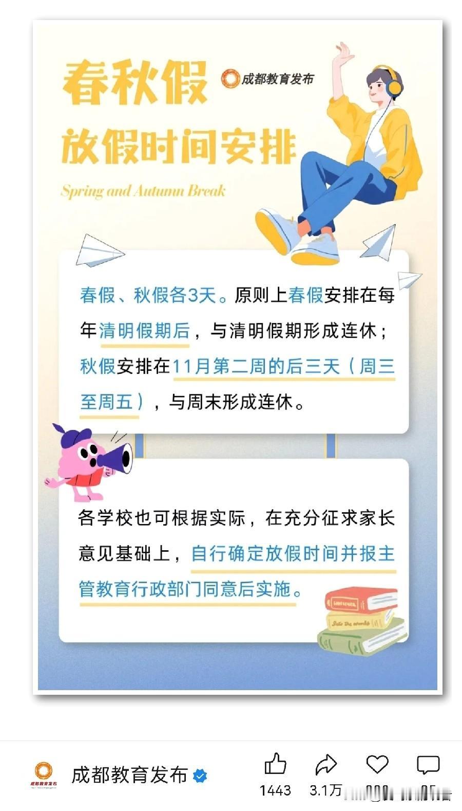 娃儿们的春秋假来了, 下周就可以放秋假了, 加上周末有5天假期, 也算得上是一个小长假, 抛开作业不说, 5天时间成都到全国各地, 任一地方打个来回都很轻松了, 这主要看家长有没有时间陪, 春秋假对娃儿来说绝对是一件好事。