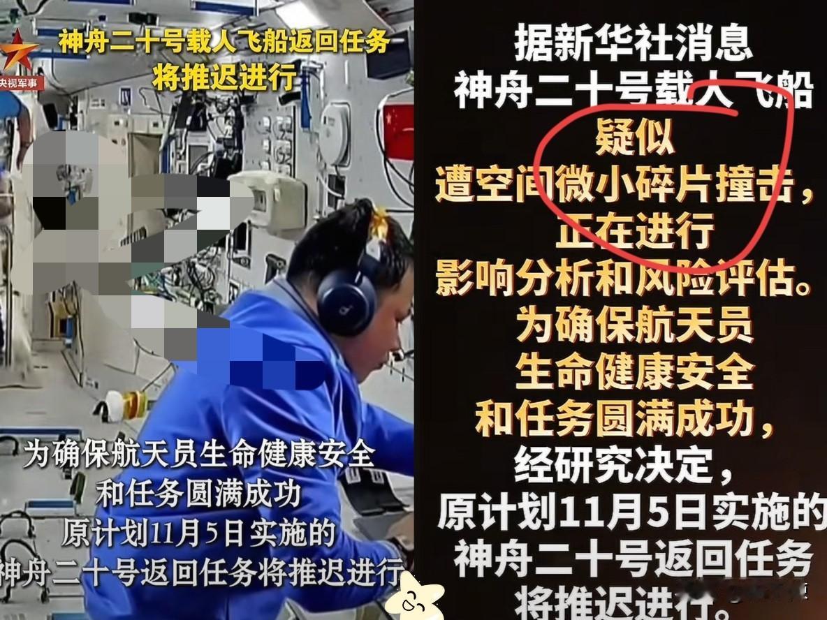 估计现在最让人担心的, 就是神舟二十号的航天员,不是任务没完成,也不是交接出问题,偏偏在返程节骨眼上出了岔子! 11月4号刚完成顺利交接,原计划5号就能平安落地,结果载人飞船疑似遭到太空微小碎片撞击,返回时间只能临时调整! 可别小看这些太空碎片,毫米级的个头飞起来速度比子弹还快,半点马虎不得! 但说真的,这次推迟反而让人更踏实!咱们中国航天早就把风险想到前头了:飞船外层有“铝合金+玄武岩”的防护铠甲,地面有全天候监测网盯着太空环境! 还有应急修补的“太空创可贴”,甚至神舟二十一号已对接待命、地面热备份飞船随时补位! 这哪是突发状况的慌乱,妥妥是中国航天“不赌运气、只靠硬实力”的底气!目前航天员状态稳定,还在空间站继续开展实验,这份从容背后全是实力支撑! 希望神舟20号的航天员乘组早日凯旋归来!