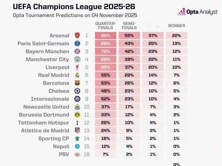 欧冠最大夺冠热门就是阿森纳! 高达22%的概率拿到冠军,英超+欧冠?这支阿森纳感觉势不可挡。 卫冕冠军大巴黎只有13%。 德甲霸主拜仁只有12%。 英超前霸主曼城11%。 利物浦还有9%。 皇马剩下6%.... 巴萨剩下5%.... 其他豪门更不可能夺冠,看来阿森纳王朝来啦,即便有人看衰他们,事实摆在眼前。[大金牙]