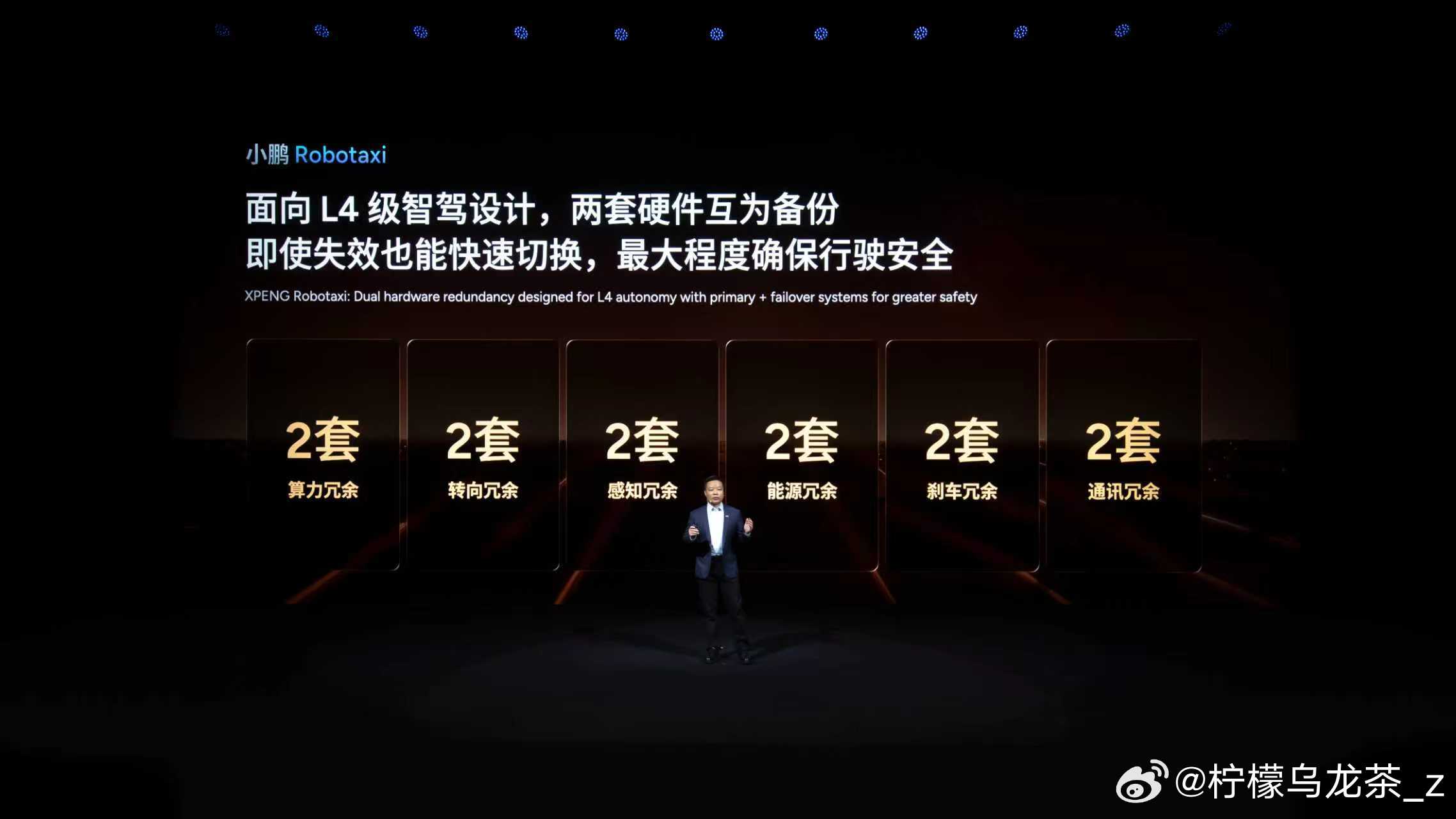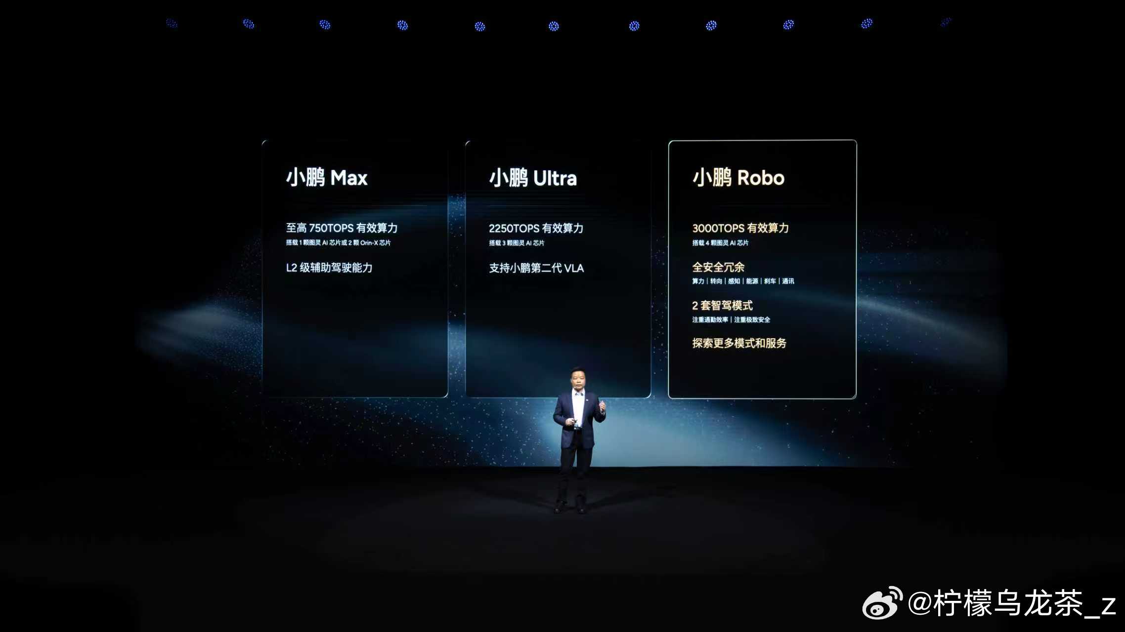 L2 级智驾能力的Max;拥有L4软件能力,但是还是L2硬件和法规的第二代 VLA 的Ultra;以及和Robotaxi同源,具备3000Tops有效算力,2套硬件系统安全冗余,以及2套智驾模式的小鹏Robo。