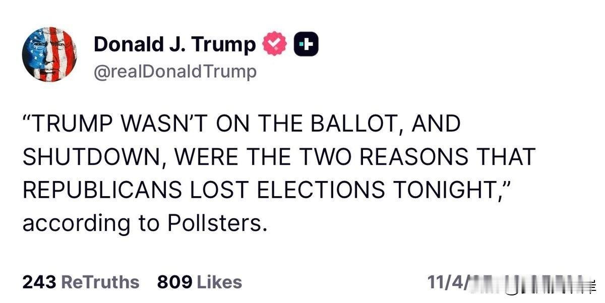 面对选举夜的惨败,川普使用了终极大招—甩锅,他引用民调专家的话来为自己背书。 “川普没有出现在选票上,以及政府停摆,是共和党今晚选举失利的两个原因。” 弗吉尼亚州和新泽西州等地的选举结果,彻底打脸川普见人就说的“赢麻了”论调,选举结果反映了民众的不满,中期选举悬了!