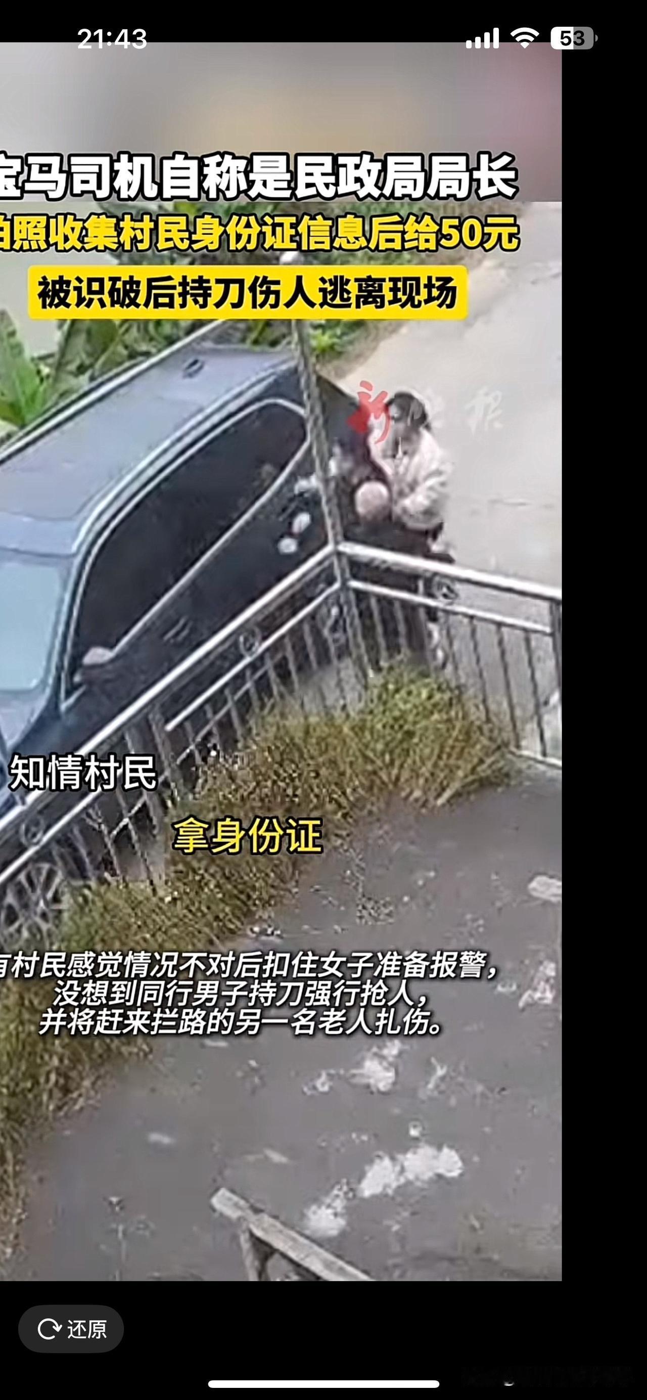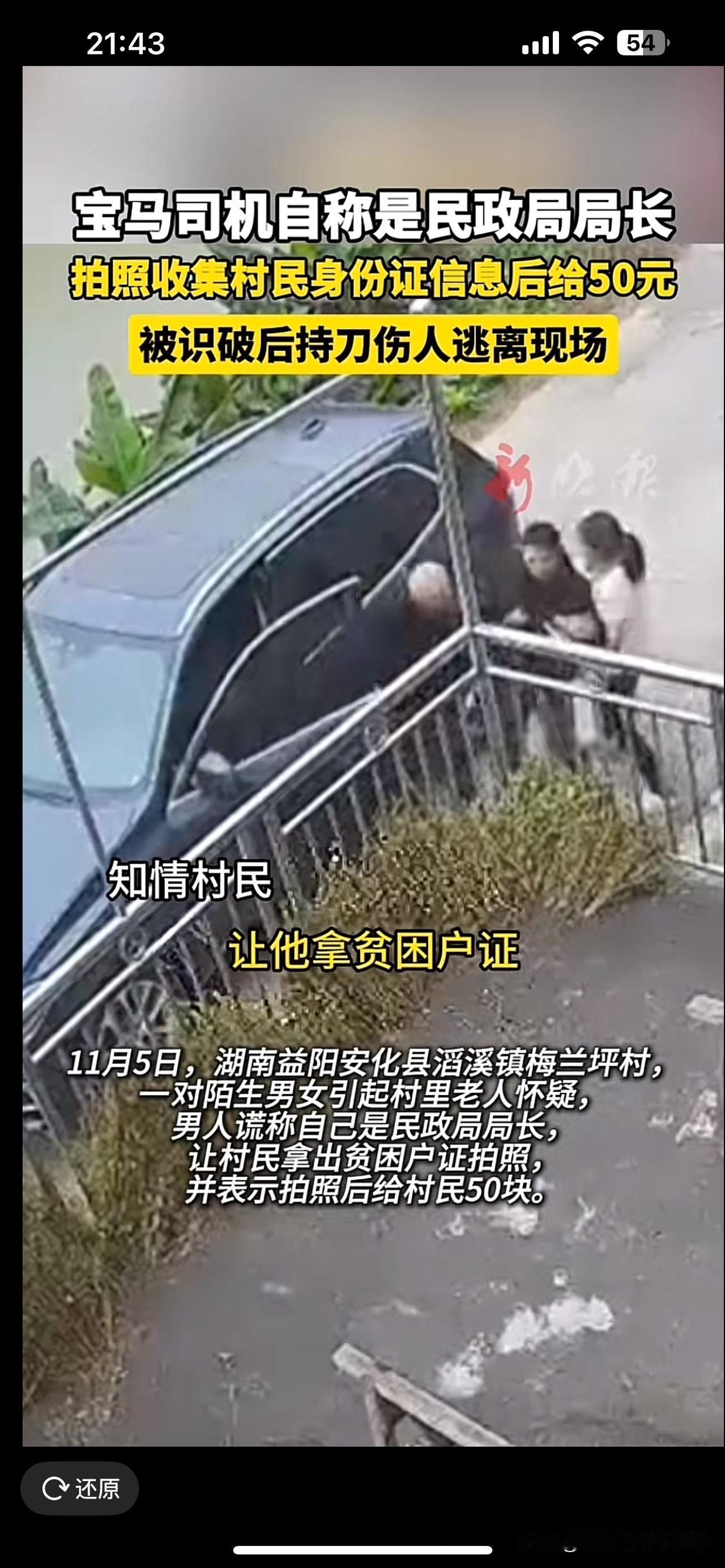 令人发指,湖南益阳安化县淘溪镇的梅兰坪村,11月5号,一对陌生男女开着一辆宝马进入了这个村子,自称是民政局的, 说是来拍贫困户的证件照,还许诺给50块钱报酬。乍一听感觉对老百姓还挺关心 但他们却要求村民拿出身份证还有银行卡,还叮嘱别对外说你说说出这句话得有多可疑? 最令人感到庆幸的是,当地的老人对他们产生了疑虑。这位老人并没有直接相信他们。与此同时,村民也警觉起来。邻居开始计划报警,并且试图夺走车钥匙,没有想到。男子竟然持刀划破邻居的手 随后呢,驾车逃逸,可见他们心里有鬼 目前当地警方已经介入调查,相信监控拍的很清楚,帽子叔叔要想抓到他们并不难, 要知道这些骗子确实很狡猾,他们专挑农村偏远地区的老人下手。利用老人信息闭塞、缺乏防范意识的弱点来实施诈骗 这种没有良心的事情他们也做的出来。纯粹就是犯罪成本太低了,自然妖孽就肆无忌惮。