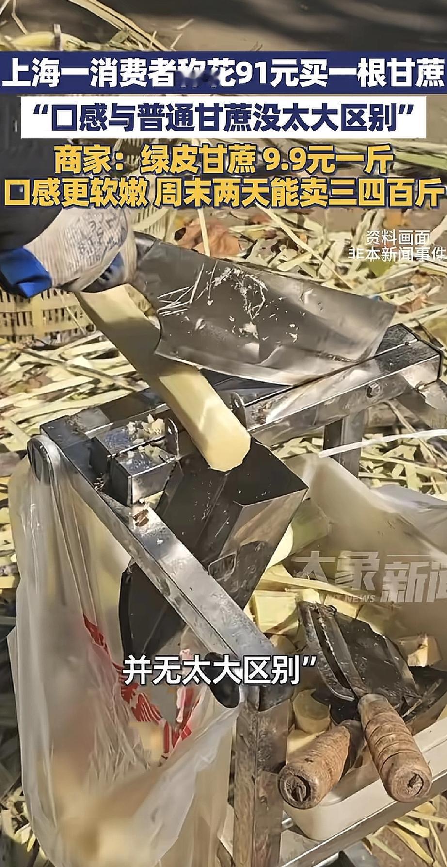 上海有位消费者买了根甘蔗,一看小票傻眼了——竟然要91块钱! 商家解释说,这是绿皮甘蔗,卖9.9元一斤,口感更软更嫩,周末两天能卖三四百斤。 可顾客尝了后却觉得,和普通甘蔗没啥太大区别。 花近百元买根甘蔗,这价格确实让人咋舌。看来买东西还得擦亮眼睛,别光听宣传,毕竟谁的钱都不是大风刮来的呀。