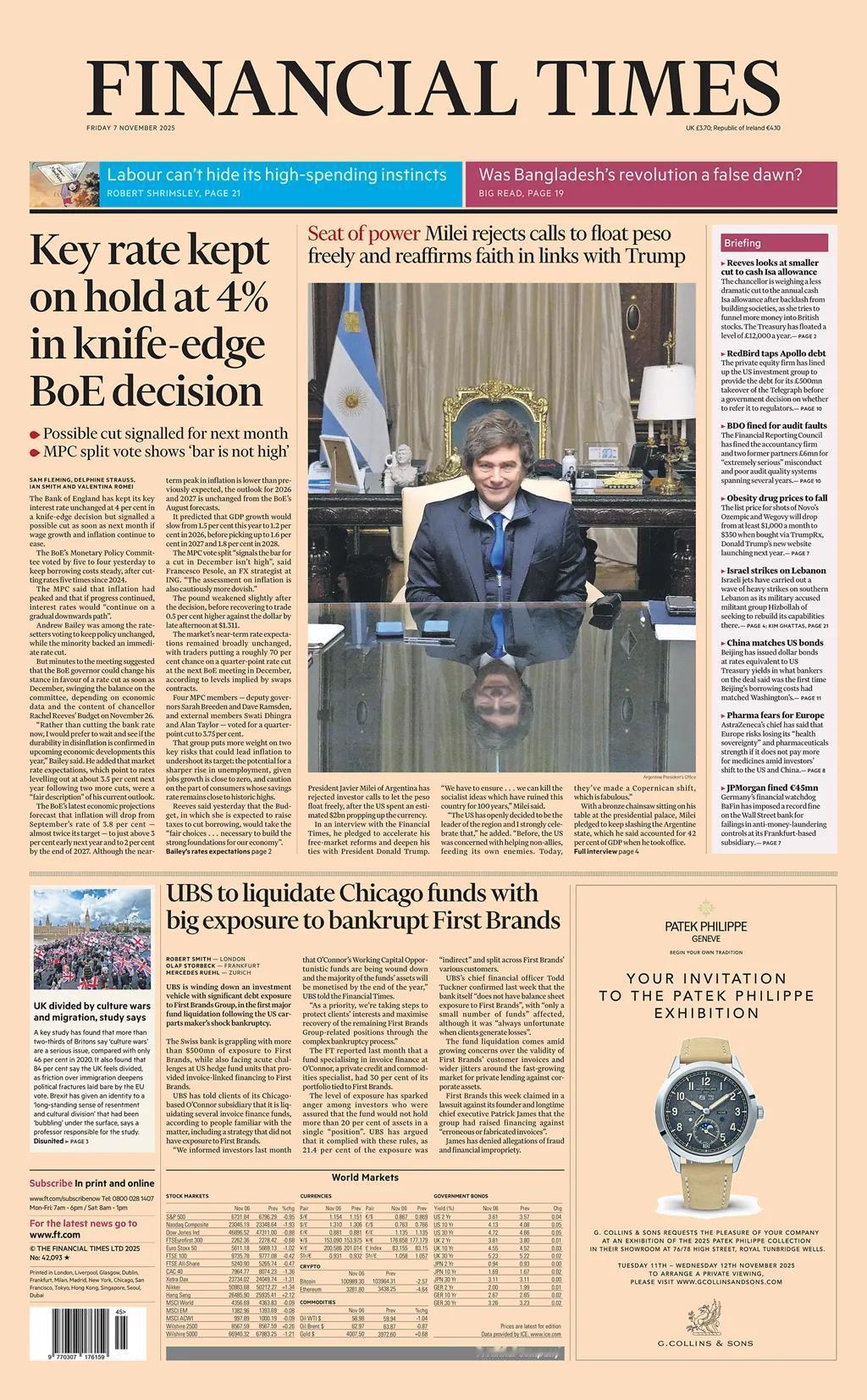 《金融时报》称,照片显示,度过“危险期”的阿根廷总统米莱,回到权力中心。 米莱拒绝让比索自由浮动的呼声,并重申对与特朗普关系的信心 另外该报关注了,英格兰银行决定将利率维持在4%不变是一个“刀尖上的决策”。