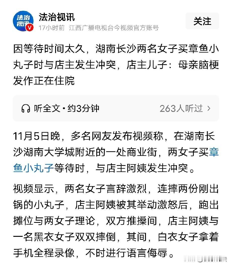 湖南长沙,2名女子付了12块钱,点了章鱼小丸子,等了约12分钟不耐烦要退单,摔了小丸子,还摔了别的顾客的小丸子,甚至辱骂店主阿姨,双方起了冲突,店主称回来时,发现母亲瘫在地上,浑身发抖,2名女子还骂母亲:“臭不要脸”!为此,母亲受惊吓脑梗发作已经住院。他想让2名女子承担法律责任。 11月5号,湖南大学城附近的商业街,晚上一片热闹景象,可谁也没想到,一个卖章鱼小丸子的摊位前发生了不和谐的一幕,被人拍了下来,发到网上。 2名年轻女子,一个穿黑衣服,一个穿白衣服,因等待章鱼小丸子的时间过长,不知怎的和店主阿姨起了冲突。 冲突中,2名女子摔了小丸子,还骂了阿姨。 视频中可以看到,在争执中,黑衣女子与摊主阿姨发生推搡,阿姨和黑衣女子一起摔倒,白衣女子在一旁录像,还骂骂咧咧的。 11月6号,店主槽先生说,母亲因为冲突受了惊吓后脑梗发作,已经住院了,他为了照顾母亲店也歇业了,希望那2名女子承担责任。 曹先生对事发当天的情况进行了讲述,这2名女子就是因为等的时间长了,跟自己母亲发生了争执。 原来,曹先生家的章鱼小丸子5份一锅出,做好一锅大概需要10分钟。 而2名女子在晚上6点零4分下单,排在第二位,而这时,曹先生母亲已经下锅开始制作,接下来的第三、四、五份的顾客也都付了钱,这期间不到2分钟。 而这2名女子等了大概12分钟,就有些不耐烦了,说凭什么后面排队的顾客能跟她们一起取小丸子,她俩却要等这么长时间?还要求退单。 这时候,曹先生母亲跟她们说,刚做好小丸子,准备给2名女子调好口味,就给她们。 不曾想,黑衣女子拿过小丸子突然摔在了地上。 曹先生说,当时母亲觉得摔就摔了,毕竟是2女子付了钱的,不管摔了,还是丢了都是她们的事。 可没想到,白衣女子突然拿起一份别的顾客的小丸子往地上一甩。 这下母亲被激怒了,觉得她们扔自己的小丸子也就算了,扔别的顾客的就太过分了,就跑出摊位和这2名女子理论,于是在冲突过程中被网友拍下。 曹先生还说,当时他和孩子去吃饭了,等回来看到母亲摔在地上,因为受了惊吓,她浑身发抖,一时都扶不起来,而那2名女子还对着母亲辱骂,说“臭不要脸”的那种侮辱人的话。 对此事,曹先生有些难以接受,他表示,做章鱼小丸子时间约10分钟一锅,而且,担心顾客站着等累,还在摊位前放了凳子就为了让顾客坐着休息。 正常来说,做小丸子不可能一份一份的做,基本上是一锅出,做一份要8分钟,做一锅12分钟,所以,5份一锅,能缩短时间,要是一份一份的做就得40分钟,那第五个顾客会等更久。 他说开店8年了,挺受学生欢迎的,没想到遇到这2名女子,她们这么做就是在闹事。 曹先生说当天晚上他给母亲送去了医院,因母亲受了惊吓,脑梗发作,已经住院了,之后,他去报警了,目前已经立案。 他希望2名女子要为她们的行为承担法律后果。 有人说,虽然付了钱属于你自己的东西,摔自己东西也是对别人的不尊重,甚至是挑衅行为,进店吃饭那有不等的,这是无修养、无素质的表现。 这俩女的闯祸了,一锅出几份,多等了两分钟看后边别人也能在同一时间一起拿到吃的,心里不平衡,摔了自己的还把别人的一份也给摔了。阿姨出来理论又被顺势推了一把,摔倒在地又气又急脑梗发作。后续如果阿姨家人起诉赔的就不是一份小丸子的钱了,还要耽搁自己的工作生活,得不偿失啊。 曹先生称母亲在冲突中受到惊吓,引发脑梗发作住院治疗,他可以要求那2名女子承担赔偿责任吗? 《民法典》第1179条规定:侵害他人造成人身损害的,应当赔偿医疗费、护理费、交通费、营养费、住院伙食补助费等为治疗和康复支出的合理费用,以及因误工减少的收入。 如果经过专业的医学鉴定或者依据一般的医学常识,能够认定两名女子的推搡、辱骂等激烈冲突行为与店主阿姨脑梗发作之间存在因果关系,那么两名女子因过错侵害了店主阿姨的健康权,应当承担民事赔偿责任。 另外,2名女子在提出退单要求被拒后,情绪失控,先是黑衣女子摔小丸子,接着白衣女子又摔其他顾客的小丸子,还进行言语侮辱。 白衣女子在公共场所无故摔毁他人财物,并伴随言辞激烈、以及黑衣女子与店主阿姨推搡等行为,可能被认定为“任意损毁公私财物”或“扰乱公共秩序”。 白衣女子必须赔偿被摔小丸子的损失。 2名女子可能要赔偿店主阿姨因冲突导致的医疗费、误工费等合理支出。 最后想说,消费者在遇到等待时间过长等问题时,应保持理性和冷静,通过合理合法的方式表达自己的诉求,可以友好沟通或者向有关部门投诉等。 商家在经营过程中,要考虑顾客的等待体验,优化制作流程,提高效率,尽量减少顾客的等待时间。当出现问题时,及时、耐心地向顾客解释原因,寻求顾客的理解和支持,避免矛盾激化。 对此你怎么看呢? 关注@福康说法 从日常点滴学法律,生活安稳更有底