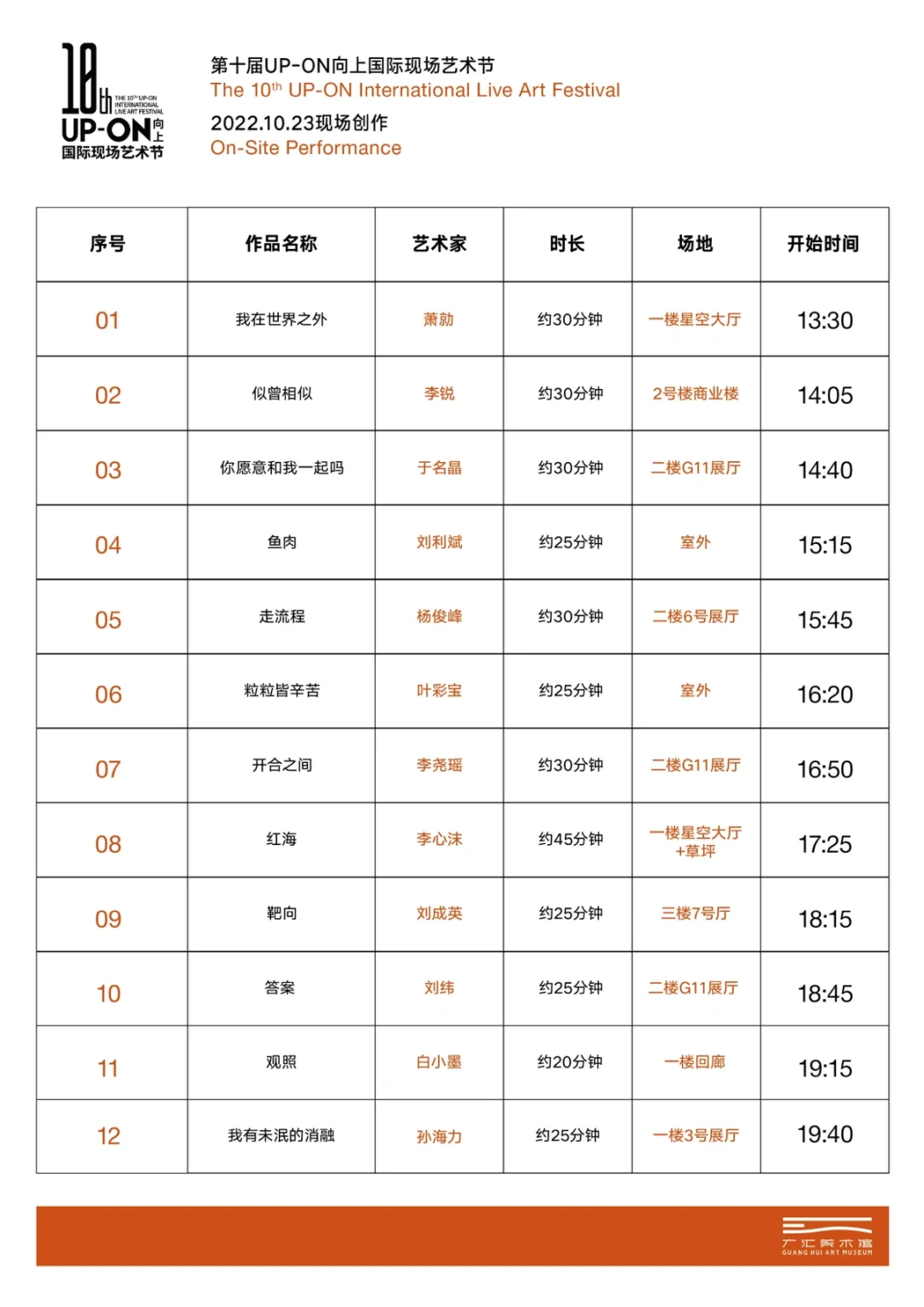 很早之前就想来📸打卡这家美术馆,趁着第十届UP-ON向上国际现场艺术节总算来了。广汇美术馆是美国OLI建筑设计事务所林兵设计,意在以“漂浮的盒子”开启艺术之旅🎨 外立面大胆用的金属🟠橙色格栅,时尚跳动,如果从远处眺望,底部被绿植包围遮挡,整个美术馆就像一个漂浮的盒子📦 因为这家美术馆收藏了很多👨‍🎨大师的作品,比如:吴昌硕、齐白石、徐悲鸿、张大千、林风眠、傅吴冠中等中国水墨画大家的珍贵作品500余件。所以在内饰的设计中,蕴含了大量的中国山水元素,山水🌊波纹的形状随处可见。 这次来参加UP-ON向上国际现场艺术节也是第一次进入场馆内部,来自全国的艺术家表演了今天11个节目,很多节目都非常具有先驱性和思想性💡 个人喜欢的三个作品《无法修复》《假如西西弗在2022》《私人泳池》。王彦鑫的《无法修复》中赠送给观众肩上的蜡烛🕯,弹奏燃烧的“小提琴”,结尾不断回声的“啊朋友再见”,黑色幽默在现场表现得野性又悲情。《假如西西弗在2022》中李艾筱收集半年自己掉落的3万多根头发,现在观众带上眼罩聆听半年的社会新闻📺,后来眼罩摘下来后,李艾筱把她的3万多根头发做成了一个发球。《私人泳池》则是四个女生在威亚起升降落里表演,最终飞入空中,扔下冰块🧊杂碎地面上的玻璃。 艺术节🎭明天还要一场,如果你之前没有看过现场艺术表演,那么一定要来,如果看过,那么更要来看,因为整个艺术节一年只有一次❗️ 🎭艺术节时间:10月22日和23日各有一场,大家可以去看23日(仅剩一天!),从13:30开始,19:40结束,满满的12个节目,节目单请看👉图9 📍Tips:目前场馆还未正式开馆(预计12月开),里面没有食物和饮水,今天为了看完所有节目,实在是又饿又渴,所以建议自带干粮和水,不过后面听说有星巴克和麦当劳,后面来看展就好得多了。 🚗地址:广汇美术馆(天府新区蜀州路2699号),开车直接导航美术馆,有停车场。 🚇地铁:地铁1号线“天府公园”站D2口步行544米,6号线杭州路站B1口出来步行891米 🎫门票:免费❗️不用预约,但是需要48小时核酸阴性证明。