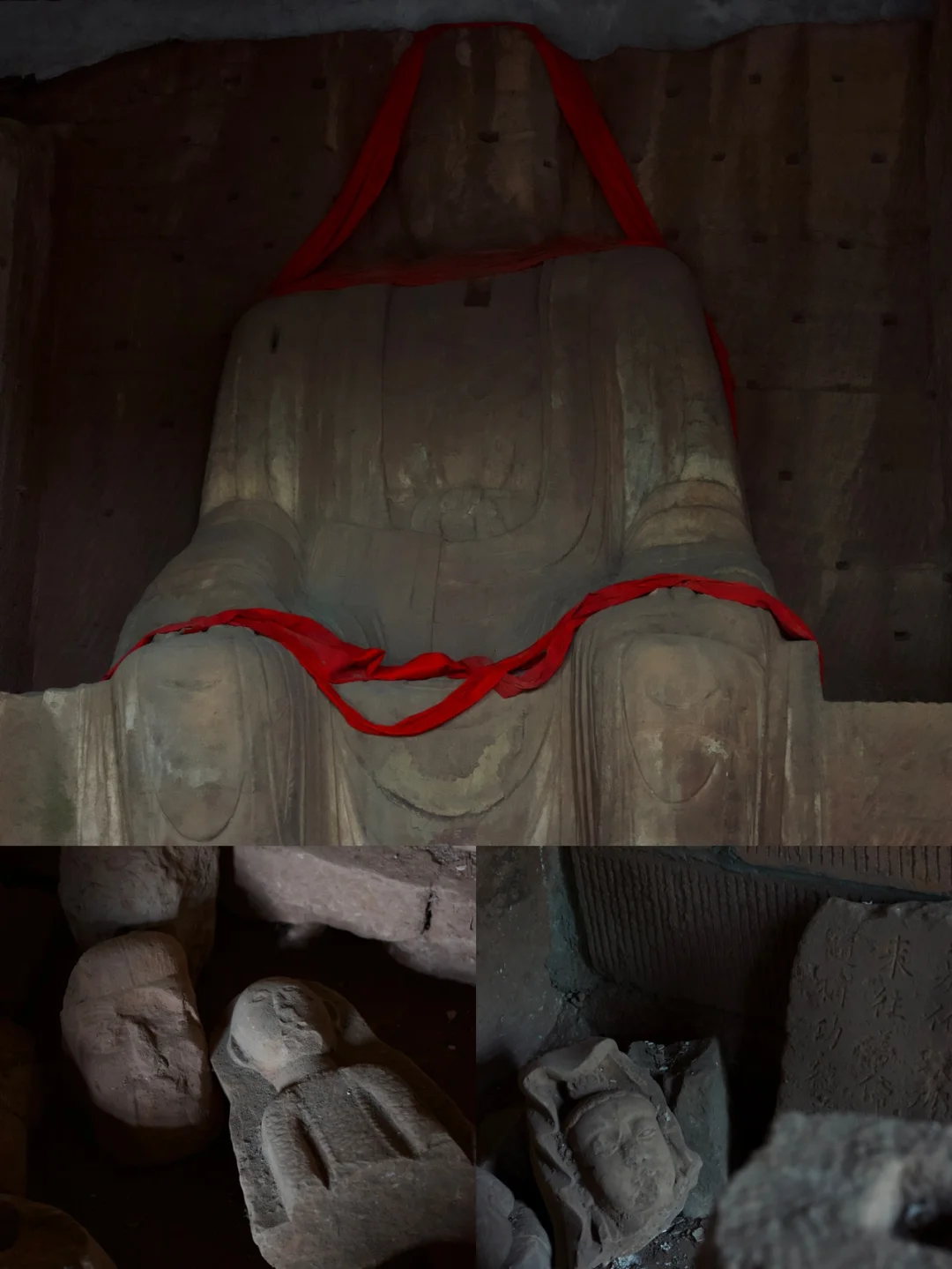 1️⃣大殿:其中大殿中一座坐佛🪷(据说殿中佛像原有三座),是唐代时期的弥勒造像,然而但是佛头上五官已经模糊不见了。坐佛的角落还要一些堆散的时刻放在地上。