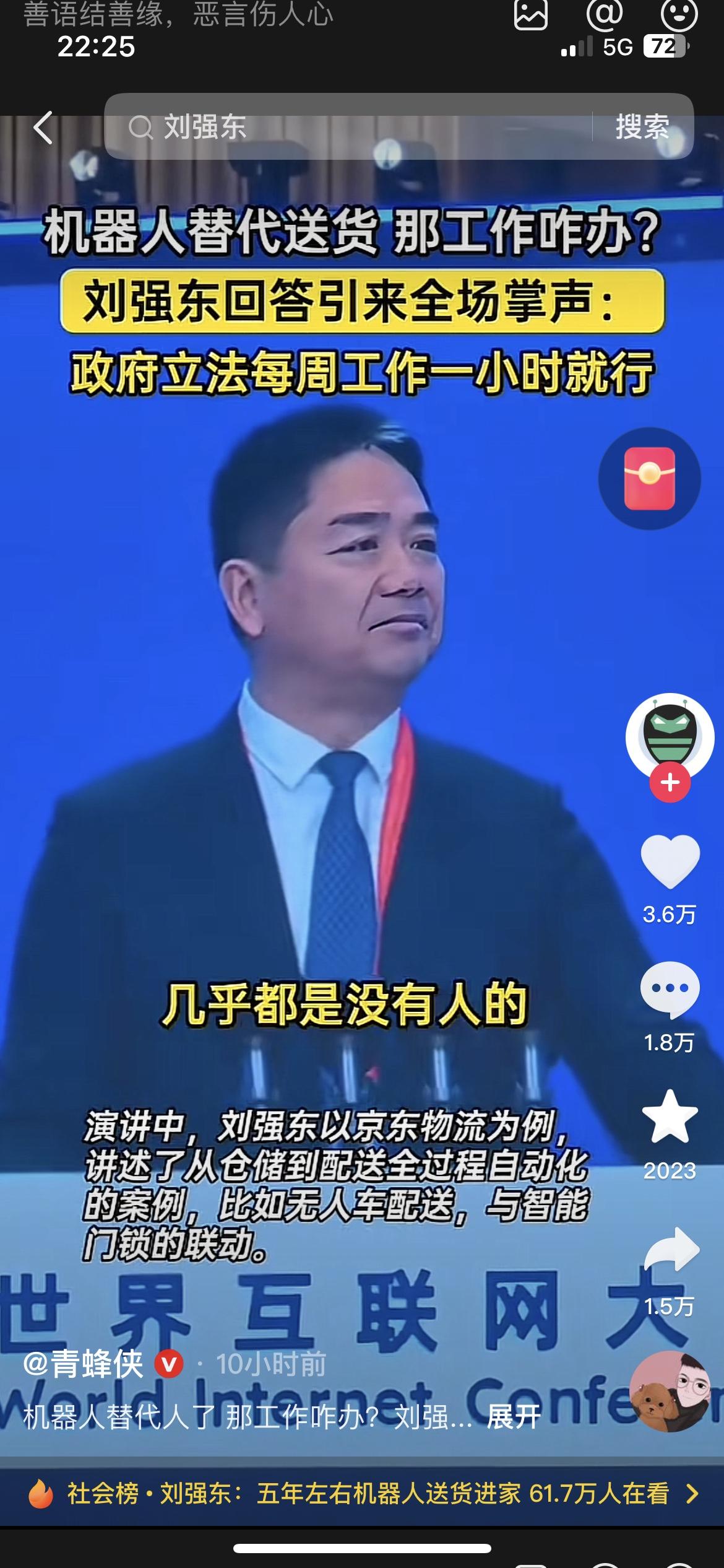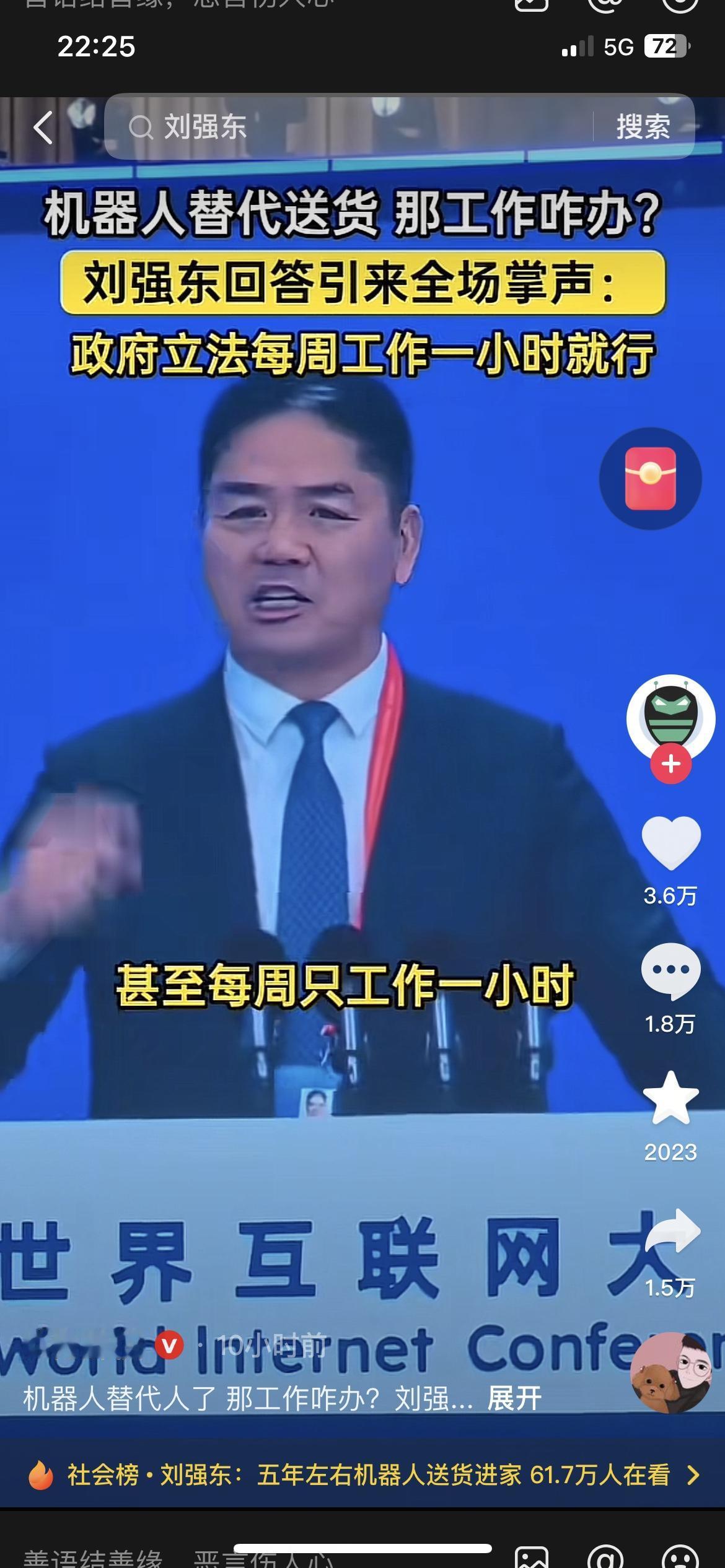刘强东炸场!建议每周上班仅1小时 刘强东这话太敢说了!公开建议“政府立法,让打工人每周只上班1小时”,当场引发现场掌声雷动! 他还说京东物流现在快没人了,全靠机器人送货。这以后快递员、流水线工人真要失业了? 你觉得每周上班1小时,能养活自己不? 赶紧转给身边打工人,这想法你支持不?