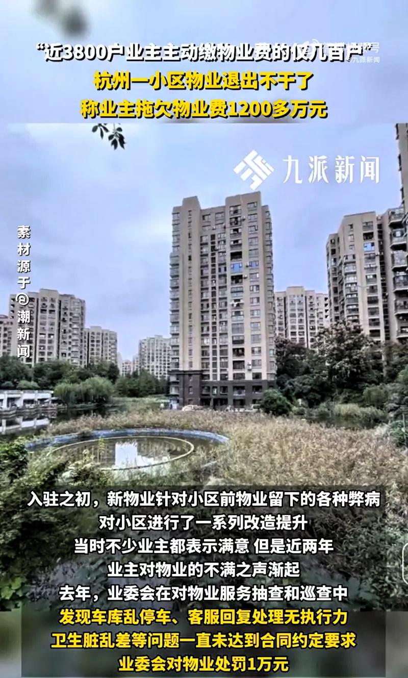杭州临平一小区(3800户、超1万居民)物业发《退出告知函》,因物业费历史欠费达1200余万元、收缴率不足50%,仅几百户主动缴费,叠加运营成本上涨,项目长期严重亏损,选择止损离场。 该小区2010年交付,2021年上海某上市物业入驻并改造提升,后因车库乱停、卫生差、人员配置不足,且物业拖欠外包保洁保安工资致罢工等问题,遭业委会多次处罚,业主不满渐增。