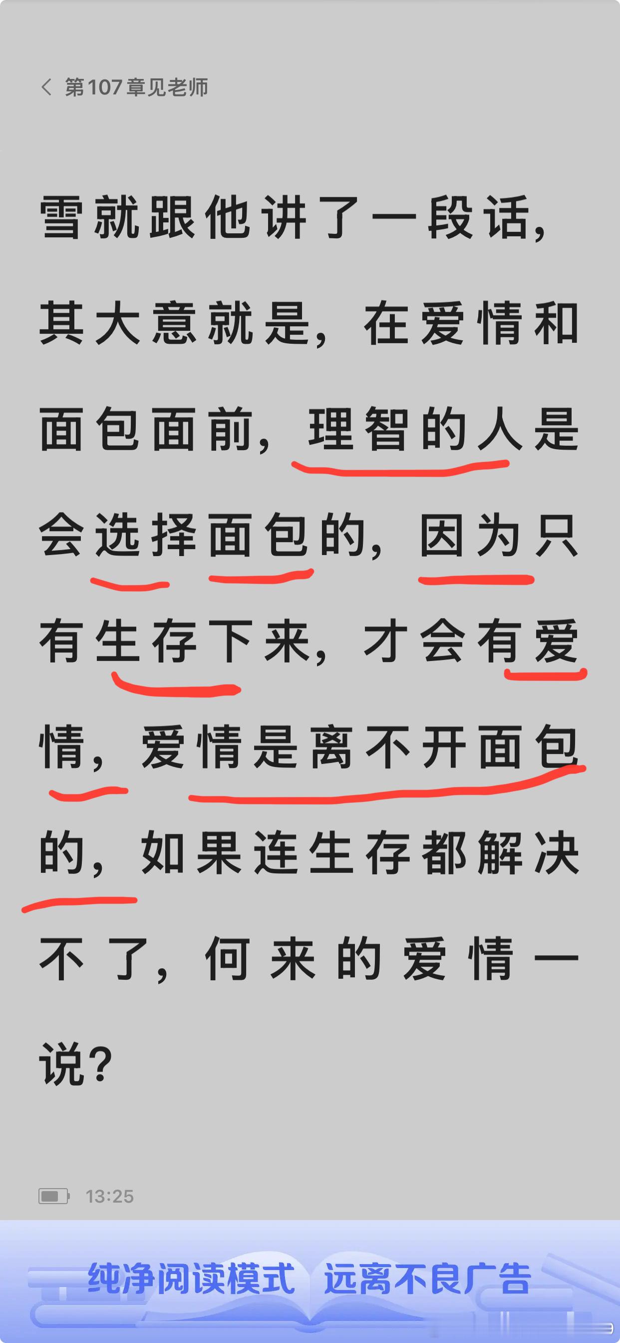 这段对话揭示了爱情与现实的深刻矛盾。梅雪的观点看似务实——生存是爱情的基石,但陈明浩事后的追忆却透出复杂况味。当理想主义撞上现实壁垒,"面包优先"的抉择往往伴随着隐秘的遗憾。这种两难困境实则是永恒的人生命题:我们既无法用爱情否定生存需求,也难以用物质完全定义幸福。真正的成熟或许正是在认清现实重量后,依然能对自己选择保持清醒与坦然。[心][心][心]