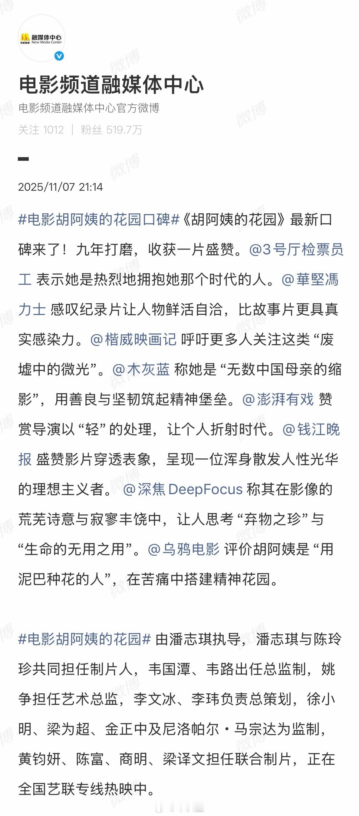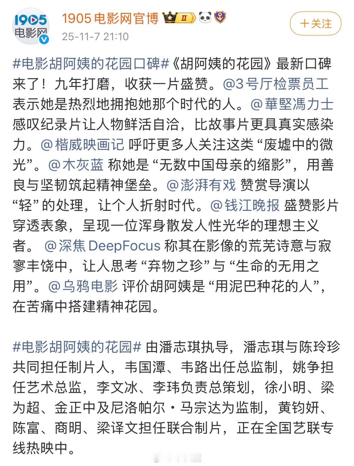 借此机会也想再次推荐这部非常好的电影「胡阿姨的花园」,是去年上海电影节的最佳纪录片。记得当时在影院看的时候,很多人都哭了。就是排片太少了,很可惜。