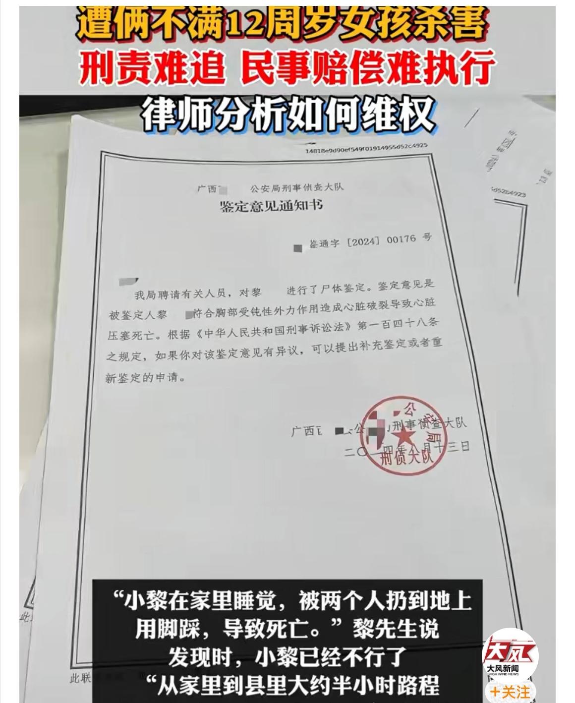 【两未成年人致7月龄婴儿死亡案后续:因未满刑责年龄未立案,民事赔偿80余万元仍未执行】 近日,广西百色某村发生一起令人痛心的案件:两名分别为11岁和9岁的未成年人A和B,将邻居家7个月大的婴儿小黎抱至屋外施暴,致其心脏破裂死亡。由于涉事二人均未满12周岁,未达到刑事责任年龄,公安机关未予立案。 据判决书显示,事发当天,A和B两次将婴儿抱至门口,在监控盲区实施暴力行为,后交还孩子母亲时,婴儿已出现窒息、面色青紫。虽经抢救,小黎仍不幸死亡。法医鉴定结果指出,系“受钝性外力作用造成心脏破裂导致心脏压塞”。 案发后,小黎母亲因受刺激确诊重度抑郁。两名施害者的监护人各赔偿5万元,法院随后判决双方共同承担赔偿90余万元,扣除已支付部分,仍有80余万元未履行。但因监护人无财产可供执行,法院已终结执行程序。 目前,两名未成年人已正常返校上学,受害婴儿父亲黎先生表示,希望追究施害者刑责,并呼吁相关部门介入。当地检察院回应,家属可提交材料进一步申诉。该案也引发公众对低龄未成年人违法犯罪惩戒与矫治机制的关注。
