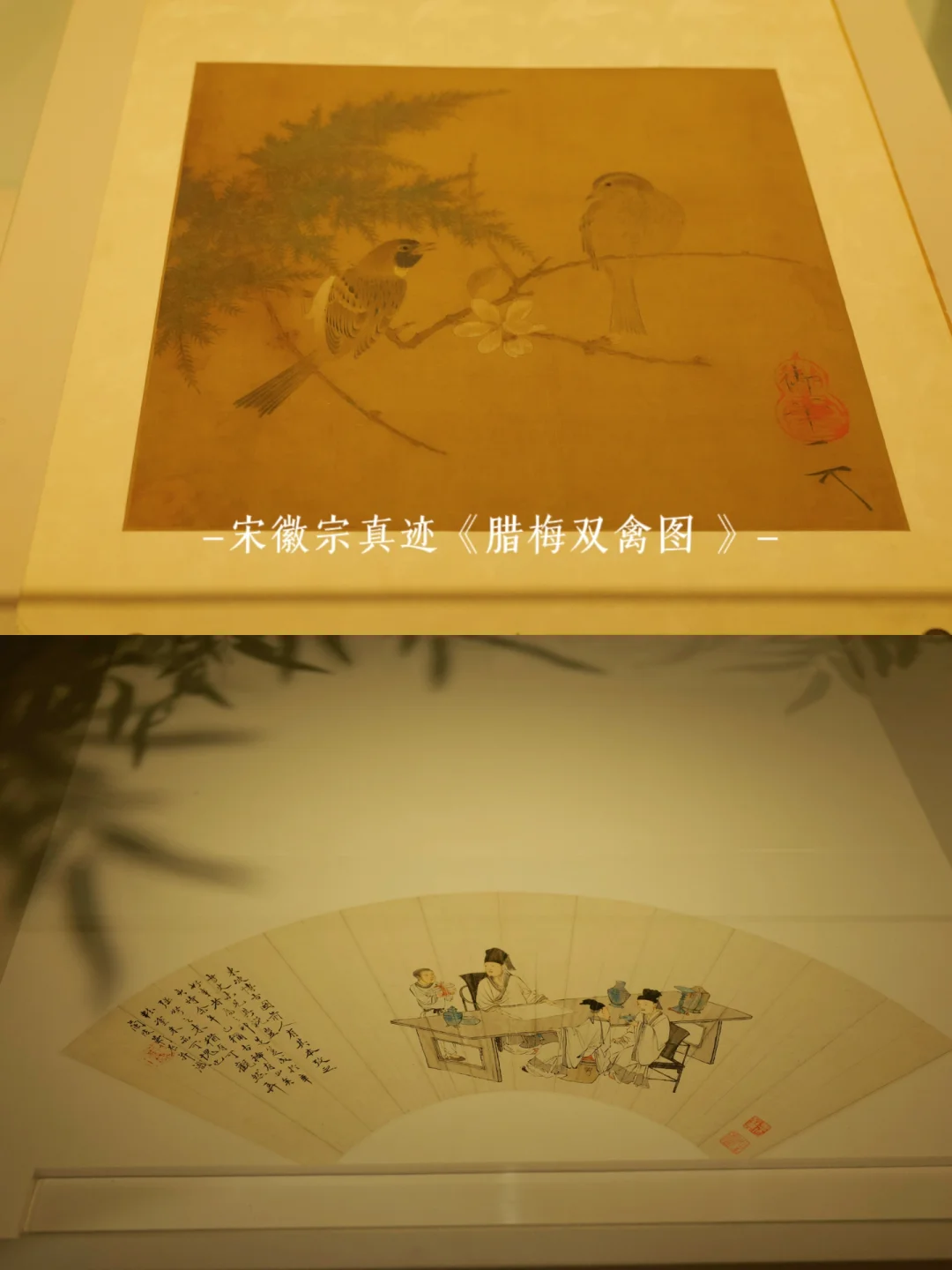 1️⃣宋赵佶腊梅双禽图:川博镇馆之宝之一,宋徽宗传世之作,上面的山雀🐦用生漆点睛,漆点会高出纸面,有立体感,下面的落款“天下一人”,上下两横是“天”字的两横,同时下面那一横又是“下”字的横画,最后以“人”字连接,形成“天”字与反写的“下”字,“天”、“下”、“人”三字连读,即是“天下一人”。