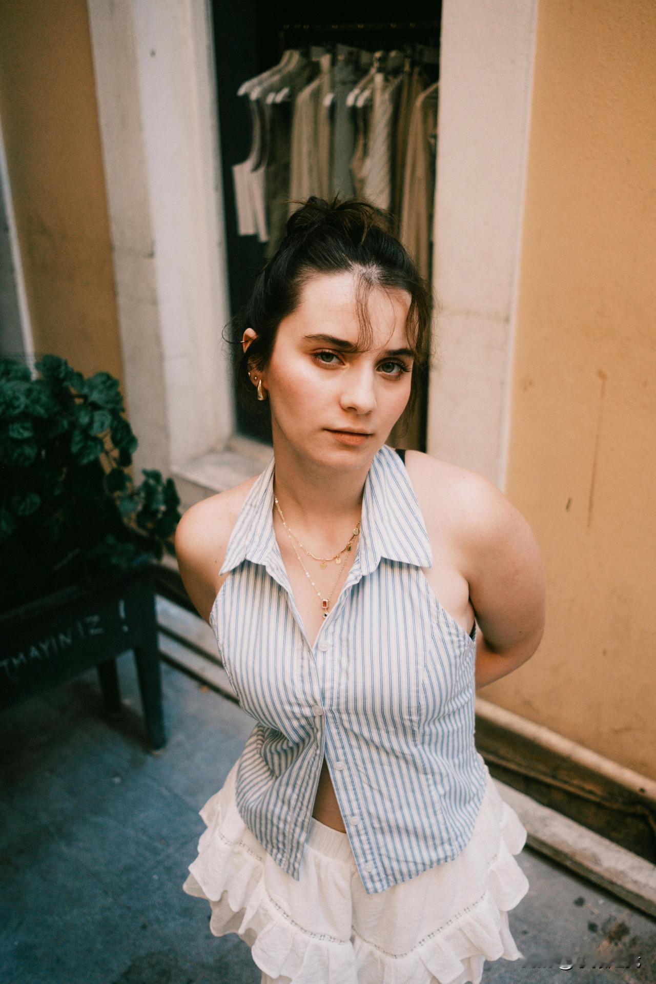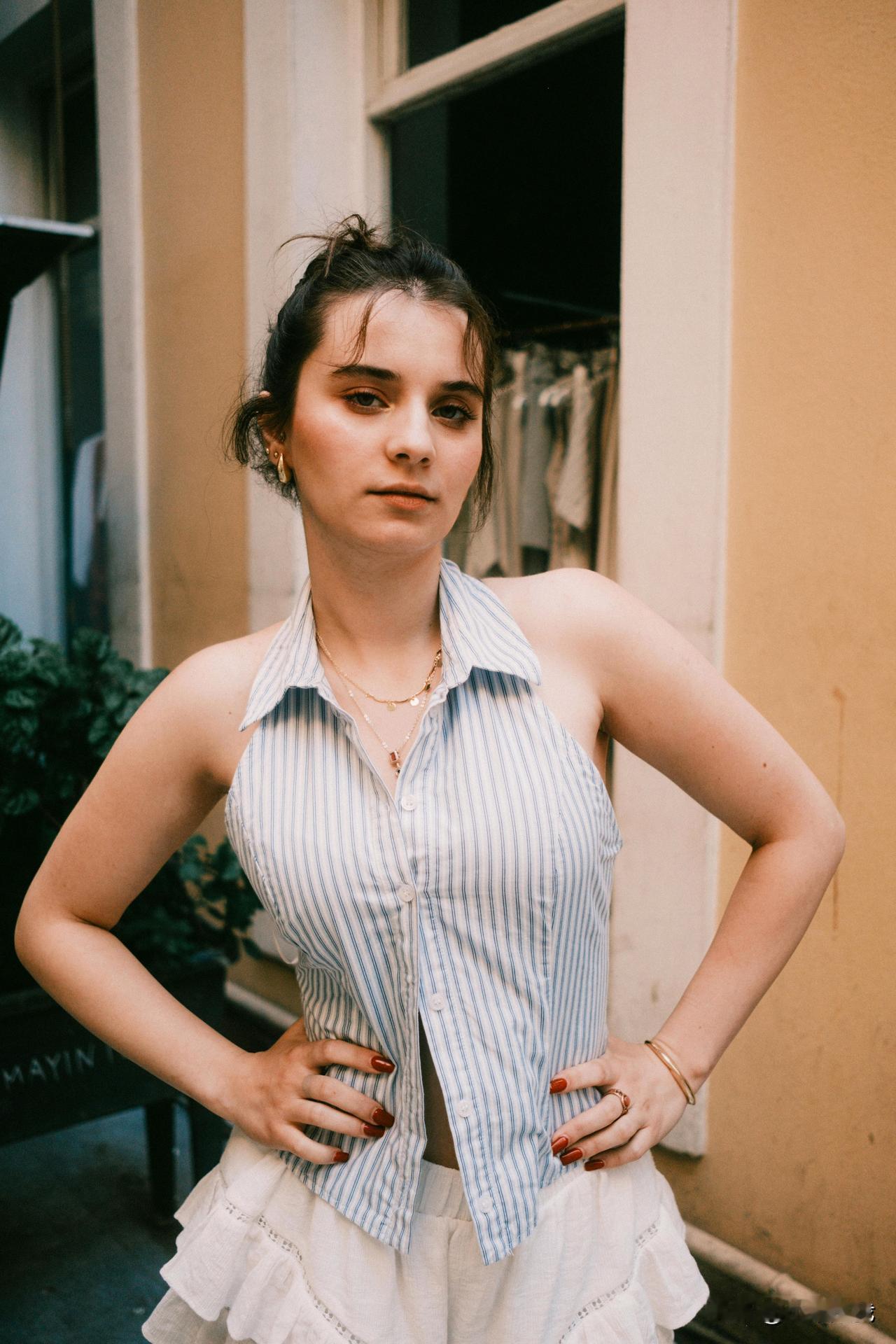 松弛的发梢和微露的肩颈,是属于街角的随性浪漫。风也刚好,把日常吹成了电影帧里的松