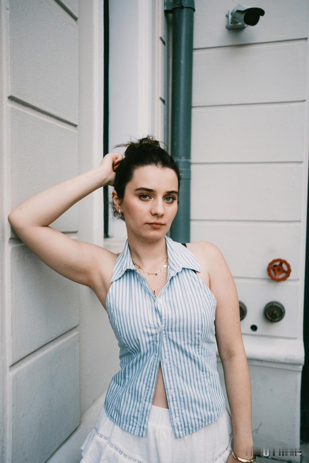 松弛的发梢和微露的肩颈,是属于街角的随性浪漫。风也刚好,把日常吹成了电影帧里的松弛感。