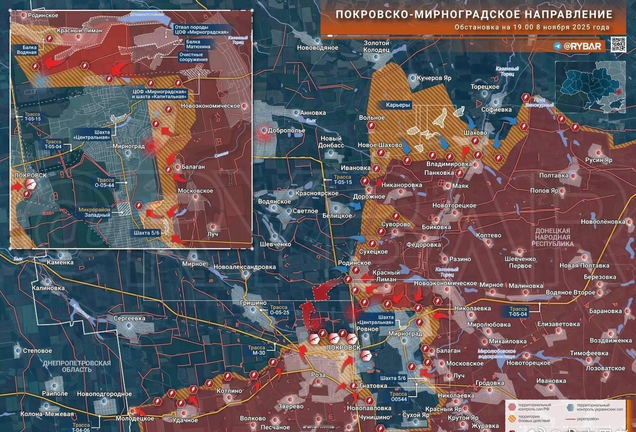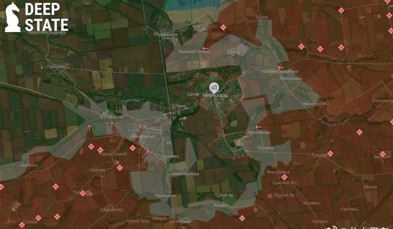 俄乌风云录,俄乌双方对波克罗夫斯克战局的看法。 俄方: 来自Rybar频道。 俄军正在接近 T0515 公路,米尔诺赫拉德仅存的补给路线通过这条公路。现在乌军补给纯靠运气。 在米尔诺赫拉德市区,俄军正在向扎帕德尼微区的公寓楼推进。在那里,乌克军建立了据点,他们的损失将导致乌军防御阵地被“分割”。 在邻近的波克罗夫斯克,俄军正在以前占领的防线上站稳脚跟,并在迪纳索维村发动攻击。乌军正在部署增援部队,但俄军无人机操作员正在途中击中他们。 米尔诺赫德的大部分地区仍处于乌军的控制之下,波克罗夫斯克北郊仍然是小团体战斗的舞台,由于无人机数量众多,难以巩固。 乌方: 来自Deepstate频道。 米尔诺赫德面临作战包围威胁,俄军全面开火,正在对乌军所有后勤路线进行物理控制。 乌军阵地所在的米尔诺赫拉德也受到威胁。 城市里几乎没有后勤,有时恶劣的天气会拯救我们,步行路线基本上不再现实,因为你随时可能遇到破坏和侦察小组的伏击、无人机袭击等。 到目前为止,米尔诺赫德集团已经成功遏制了俄军从东部对该市的猛攻,但如果没有正常的后勤通道,这很快将变得不可能。 米尔诺赫德最重要的问题是如何在没有正常后勤的情况下坚守阵地,如何进行轮换以及如何在危急情况下撤军。 在邻近的波克罗夫斯克,俄军渗透到该市几乎所有地点。 俄军正在积极将无人机机组人员拉到波克罗夫斯克,他们帮助步兵,并“对乌军任何后勤的努力造成严重障碍”。俄罗斯人也在用迫击炮打击后勤。 在这里,俄军已经事实上夺取了这座城市的领土。