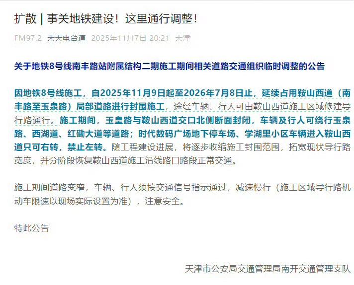 【天津这些道路封闭】因地铁8号线施工,2025年11月9日至2026年7月8日,延续占用鞍山西道(南丰路至玉泉路)局部道路进行封围施工,部分道路封闭。 (天津广播)