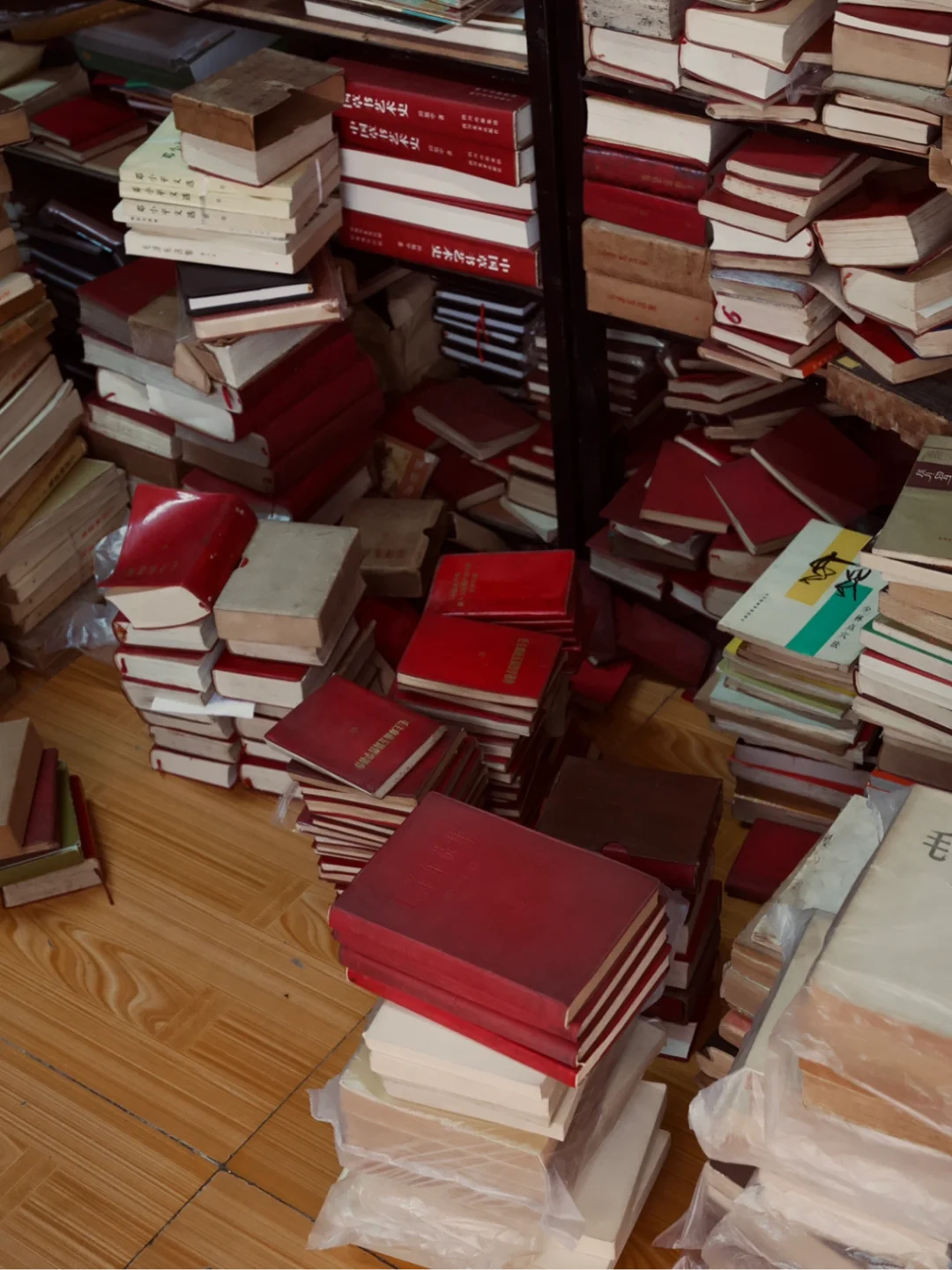 店内的书有名人选集、📕红色书籍、古典名著、医学、文学、经济等等,连环画单独成架,还用带子装好成套出售。因为书架有限,部分书籍只能推在地上。