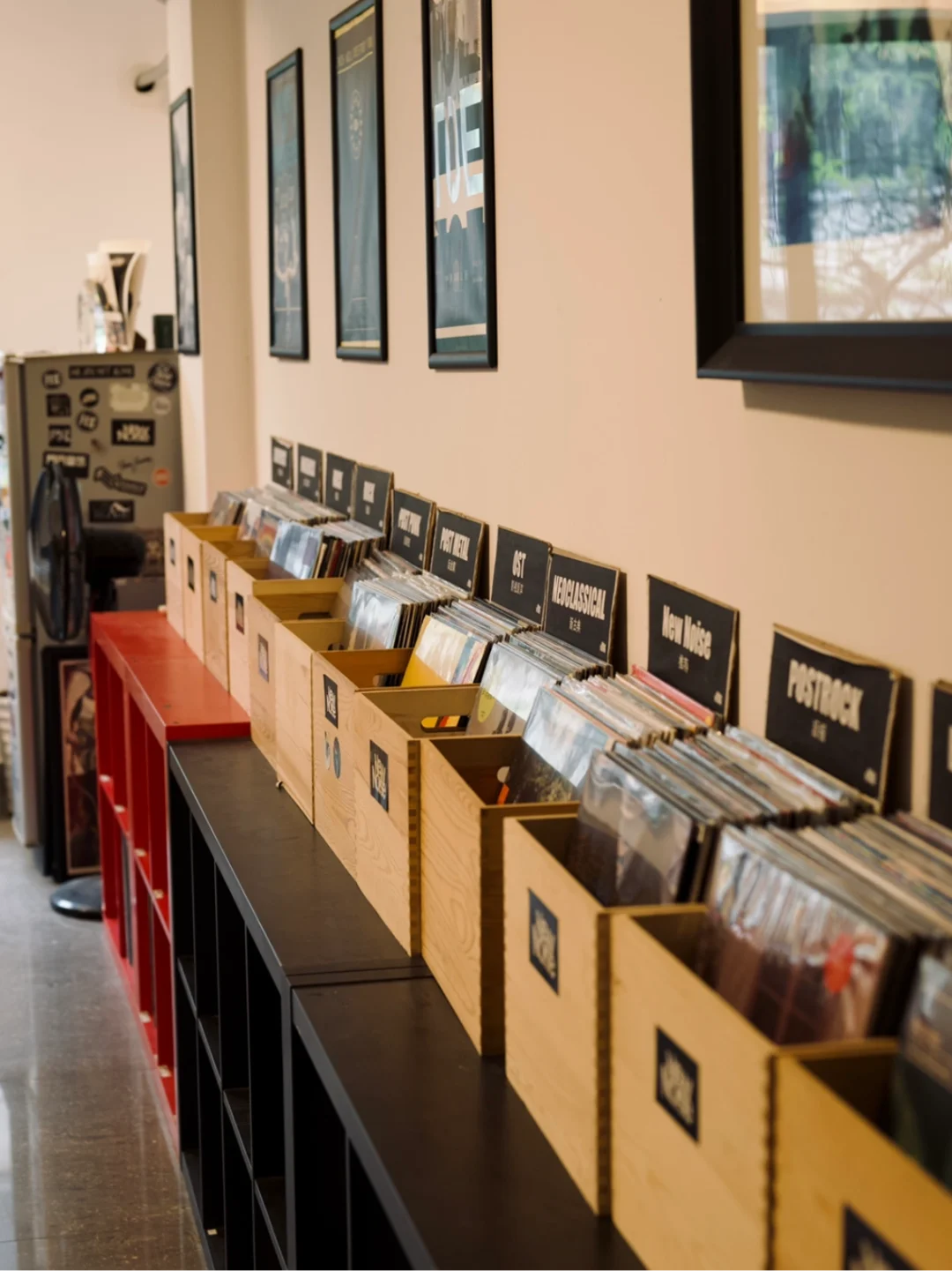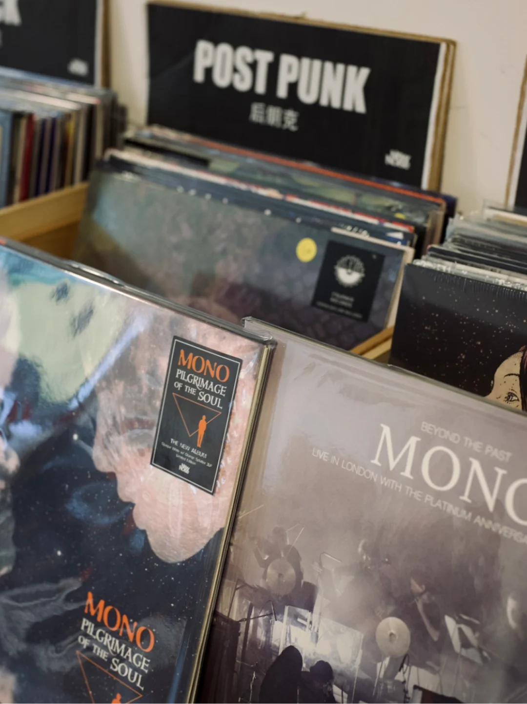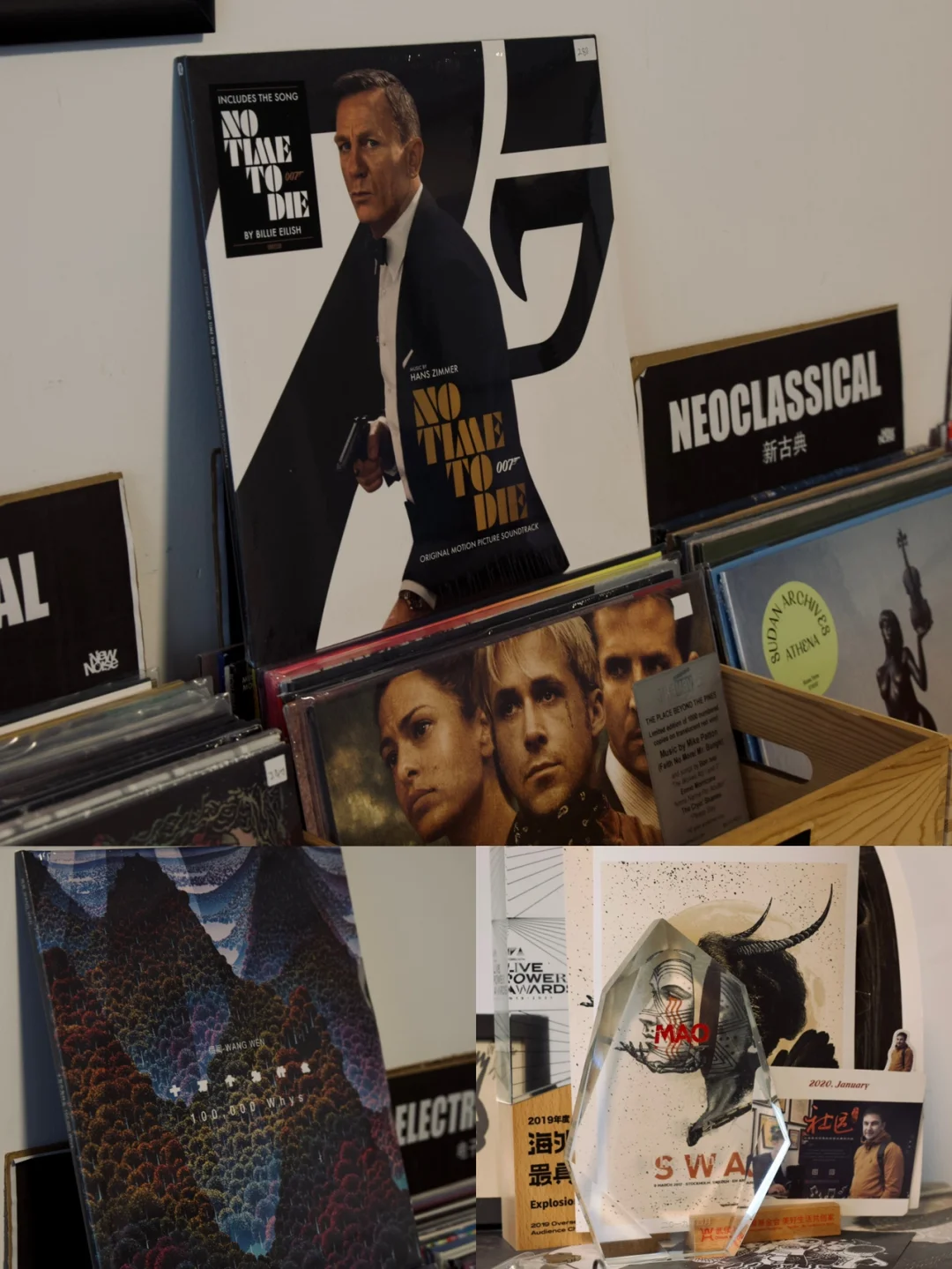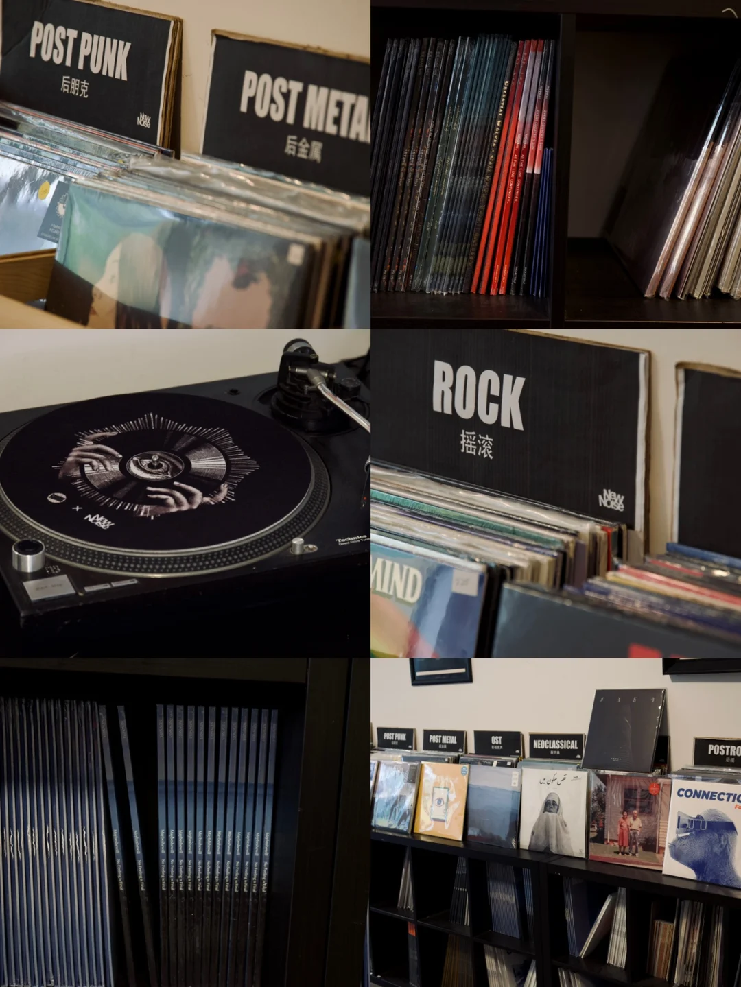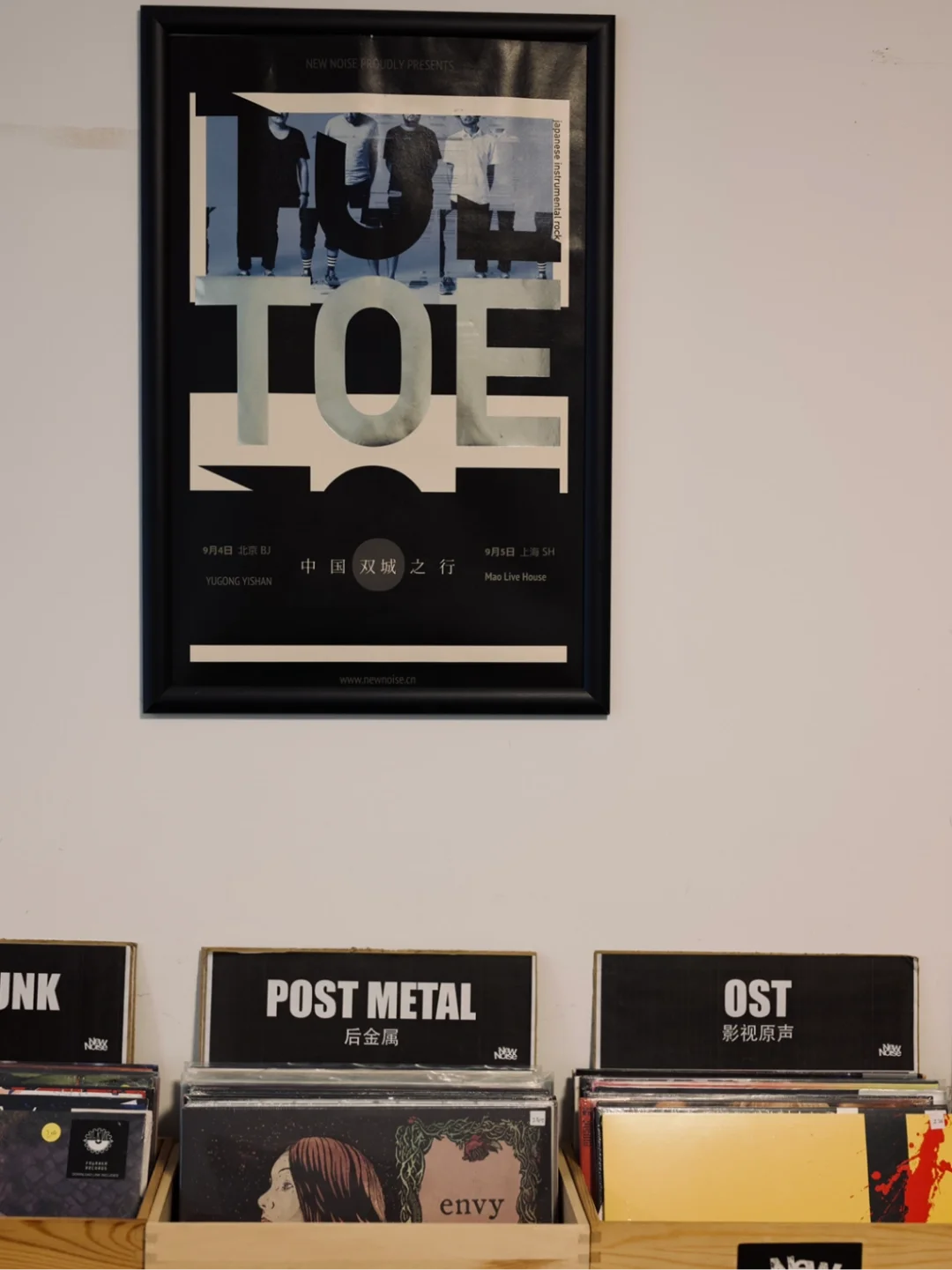 唱片店按照🤘独立摇滚、摇滚、后朋克、后金属、影视原声、新古典、后摇、电子以及New Noise推荐等类别摆放。这里是他们的唱片店也是他们的⌨️工作室,唱片架旁边就是他们的工作台,团队三个人就在这里办公,墙上有一些他们办过的演出照片。📸