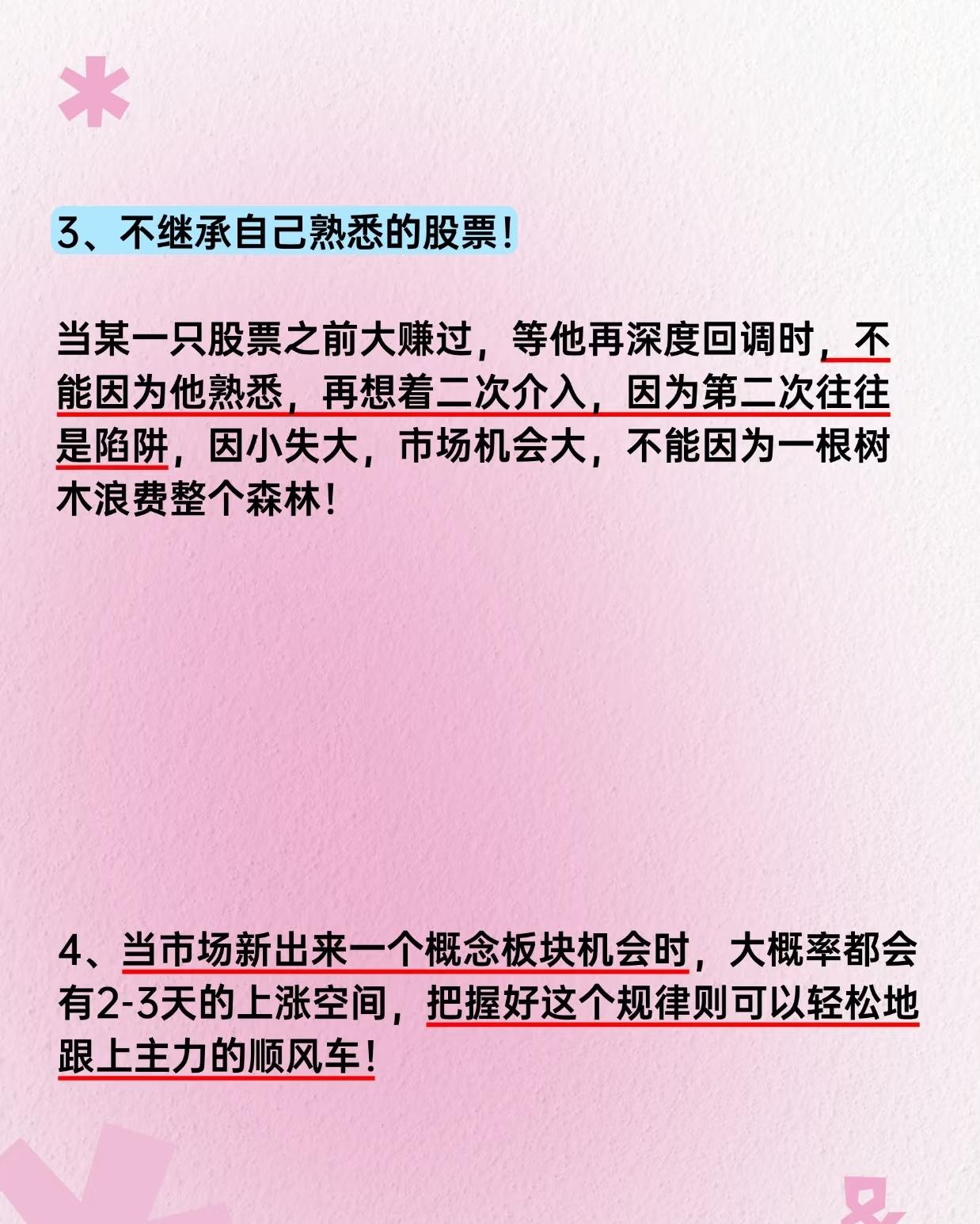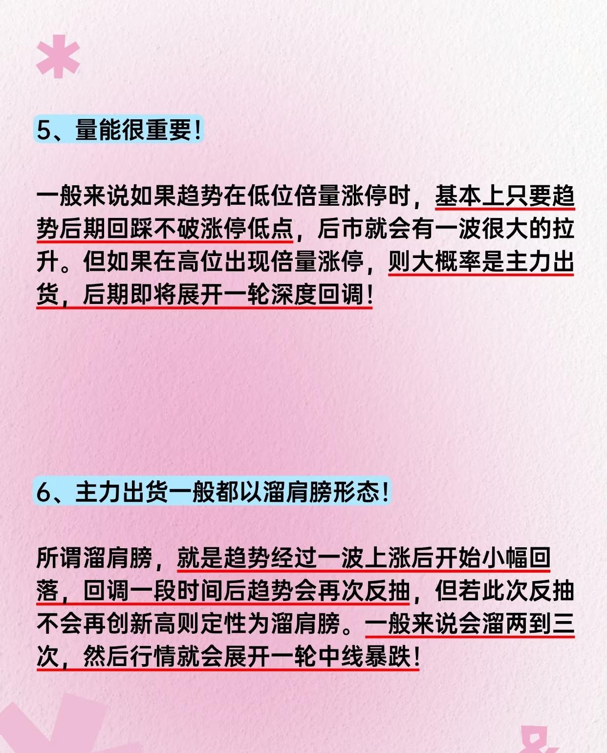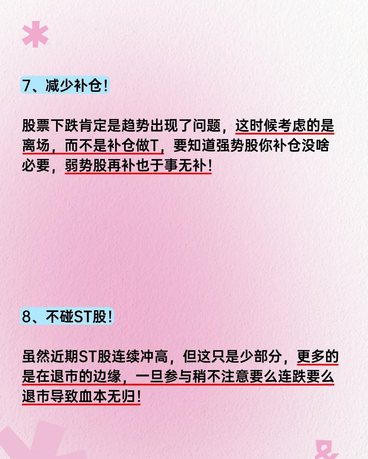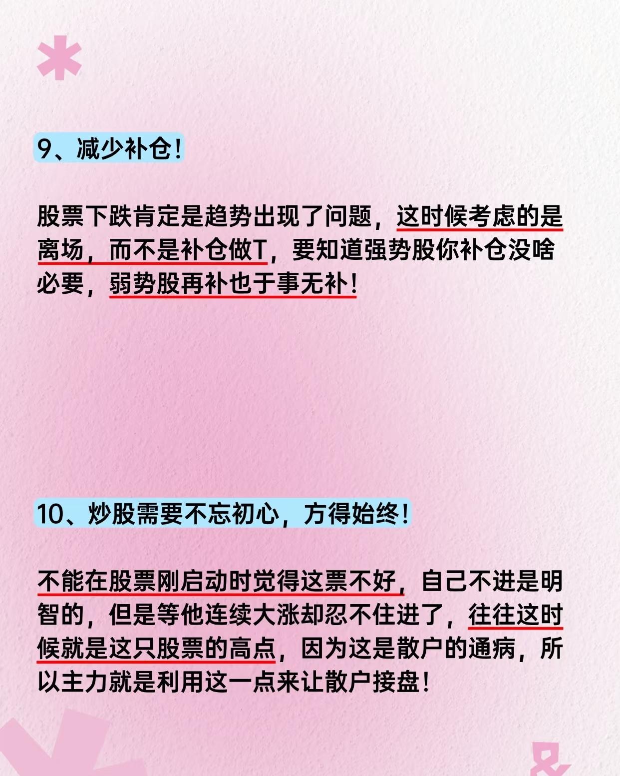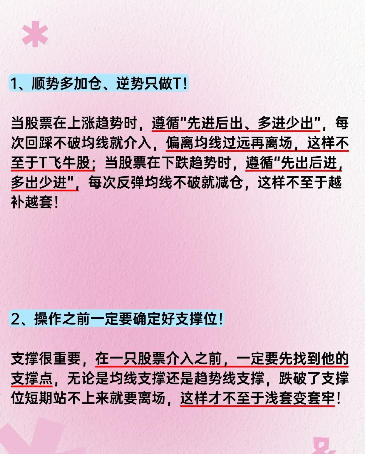 股票投资核心要点总结,按逻辑分类归纳总结:核心逻辑框架 "顺势操作+严守支撑+控制仓位+规避风险+读懂信号" - 顺势:根据趋势方向决定加减仓节奏; - 支撑:买入前确认关键支撑位,跌破则离场; - 仓位:减少无效补仓,避免越陷越深; - 风控:远离ST股、不盲目二次介入熟悉股; - 信号:通过量能(倍量涨停)和形态(溜肩膀)判断主力动向; - 心态:拒绝追高诱惑,保持初心。
