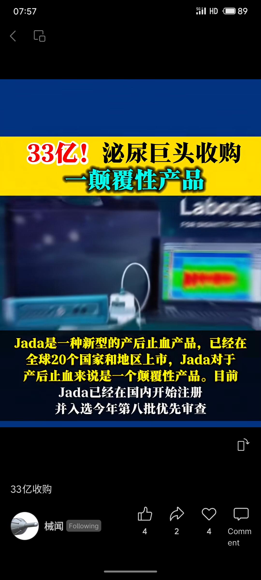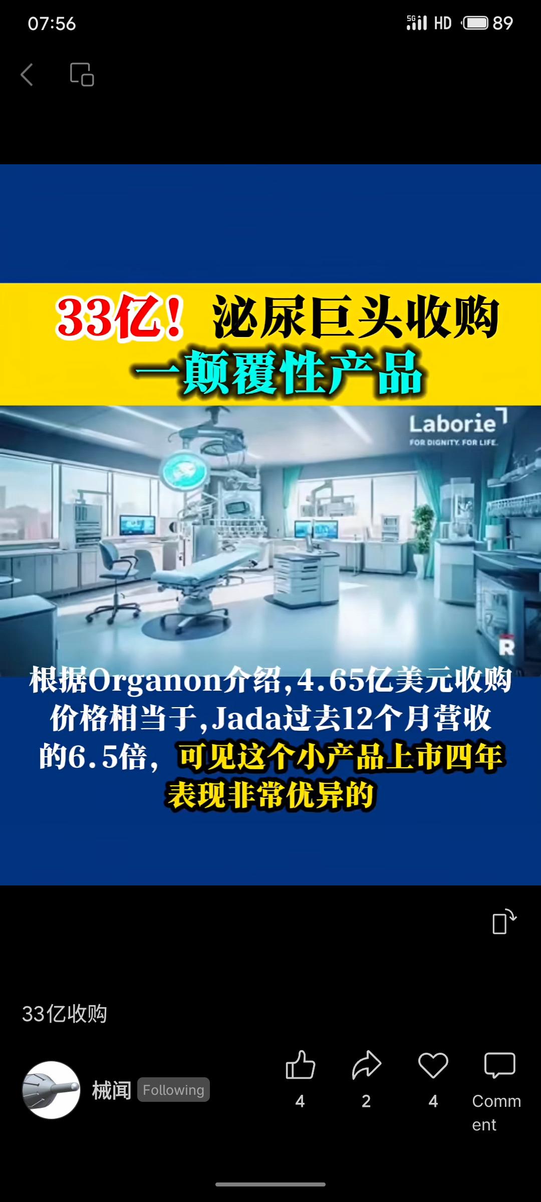 泌尿巨头Laborie Medical Technologies宣布以4.65亿美元(约合33亿元人民币)收购Organon旗下的产后止血产品Jada。该产品已进入全球20多个市场,上市四年表现优异,收购价达其过去12个月营收的6.5倍。Jada作为颠覆性产后止血方案,目前也已在国内启动注册并入选优先审评。