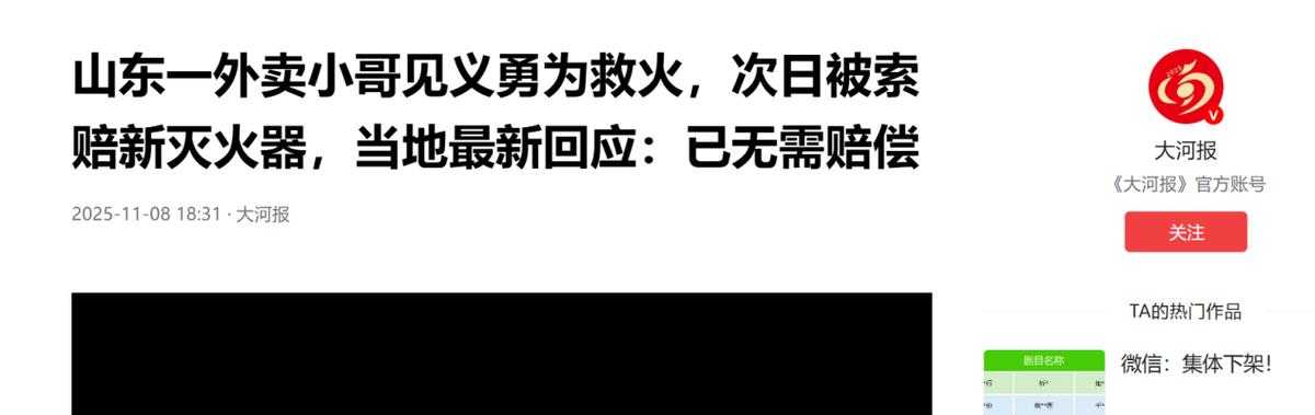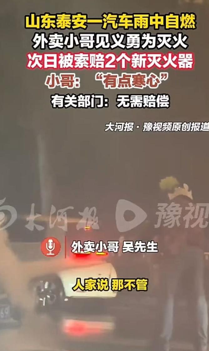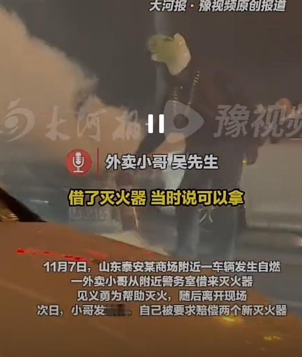 山东泰安。一车辆发生自燃,外卖小哥从附近警务室借来灭火器灭火,不料次日,被索赔2个新的灭火器!小哥:有点寒心!网友:“要赔也是起火车主赔,因为起火车是受益方,外卖小哥是施救方!” 事情发生在泰安一个商场附近,那天挺平常的,突然有辆私家车冒起了浓烟,没一会儿就燃起了明火,正好有个外卖小哥路过,眼瞅着火势要扩大,旁边就是警务室,他没多想赶紧冲进去借了两个灭火器。 对着着火的车一顿喷射,总算把火给控制住了,没让火势蔓延到周围的车辆和人群,当时火一灭,小哥看了眼订单都快超时了,没顾上多停留,跟警务室打了个招呼就匆匆骑车送外卖去了,他心里想着救人救急是应该的,借灭火器灭火也是情理之中,压根没琢磨后续会有啥麻烦。 可谁能想到,第二天小哥竟然接到了警务室的电话,对方说他用了两个灭火器,属于消耗品得赔偿两个全新的,算下来要几百块钱。 这钱对别人来说可能不算啥,但对外卖小哥来说,差不多是两天起早贪黑跑单的收入了,小哥当时就懵了,自己明明是好心救火没要任何回报,怎么到头来还要倒贴钱?他心里又委屈又寒心,感觉自己的善意被泼了一盆冷水。 这事很快被传到了网上,一下子就引发了网友的热烈讨论,几乎一边倒地替小哥抱不平,大家都说小哥是见义勇为,凭啥要他赔灭火器?“要赔也该是被救的车主赔啊!” 网友们的理由很实在,车主是这次救火的直接受益人,要是没有小哥及时出手,他的车可能早就烧得不成样子了,损失远比两个灭火器大得多,而小哥作为施救者出于好心帮忙,没功劳也有苦劳,让他承担损耗费用实在说不过去。 也有少数人觉得警务室的灭火器是公共财物,用坏了确实需要补充,不然下次遇到紧急情况就没工具可用了,但这种说法很快就被反驳了,公共消防设施本来就是为了应急用的,紧急情况下取用是天经地义,总不能因为怕损耗,就看着火蔓延吧? 而且警务室作为公共服务场所,更应该鼓励这种见义勇为的行为,而不是反过来让施救者买单,大家争议的核心,其实是怕这种 “善举要付出代价” 的情况,会让以后没人敢轻易伸出援手。 好在没过多久泰安当地的派出所介入了这件事,经过调查警方依据《民法典》给出了明确说法,小哥的行为属于 “无因管理”,也就是说他没有法定的义务去救火,但主动为了避免车主的损失而采取了行动,这种行为是受法律保护的,而灭火用掉的两个灭火器,属于为了避免更大损失产生的 “必要费用”,这笔钱不该由小哥承担,而是应该由受益方也就是车主来支付。 法律的界定一下子把事情理顺了,小哥不用自己赔钱了,心里的委屈也总算平复了,但这事并没有就此结束,它也给泰安当地提了个醒,基层在执行规则的时候不能只盯着 “财物损耗”,忽略了应急物资的本质和善意的价值。 其实消防法规里早就明确了,公众在紧急情况下可以使用周边的消防设施,可警务室的工作人员当时可能没意识到这一点,才会提出让小哥赔偿的要求。 还有网友疑问,当时火情发生时,警务室的工作人员为啥没第一时间行动,反而要靠路过的外卖小哥出手?这也暴露出基层在应急处置和业务培训上可能存在一些盲区。 泰安这次的处理挺给力,既用法律给了小哥一个公道,又及时完善了规则,让应急物资回归了它本来的用途。 希望以后不管是在泰安,还是在别的地方,遇到类似的情况,都能有清晰的规则和温暖的态度,让善意不用小心翼翼,让见义勇为的人能放心前行,毕竟只有当好人有好报、善意不被辜负的时候,社会上的互助和信任才能一直传递下去。 (信息来源:大河报——山东一外卖小哥见义勇为救火,次日被索赔新灭火器,当地最新回应:已无需赔偿)