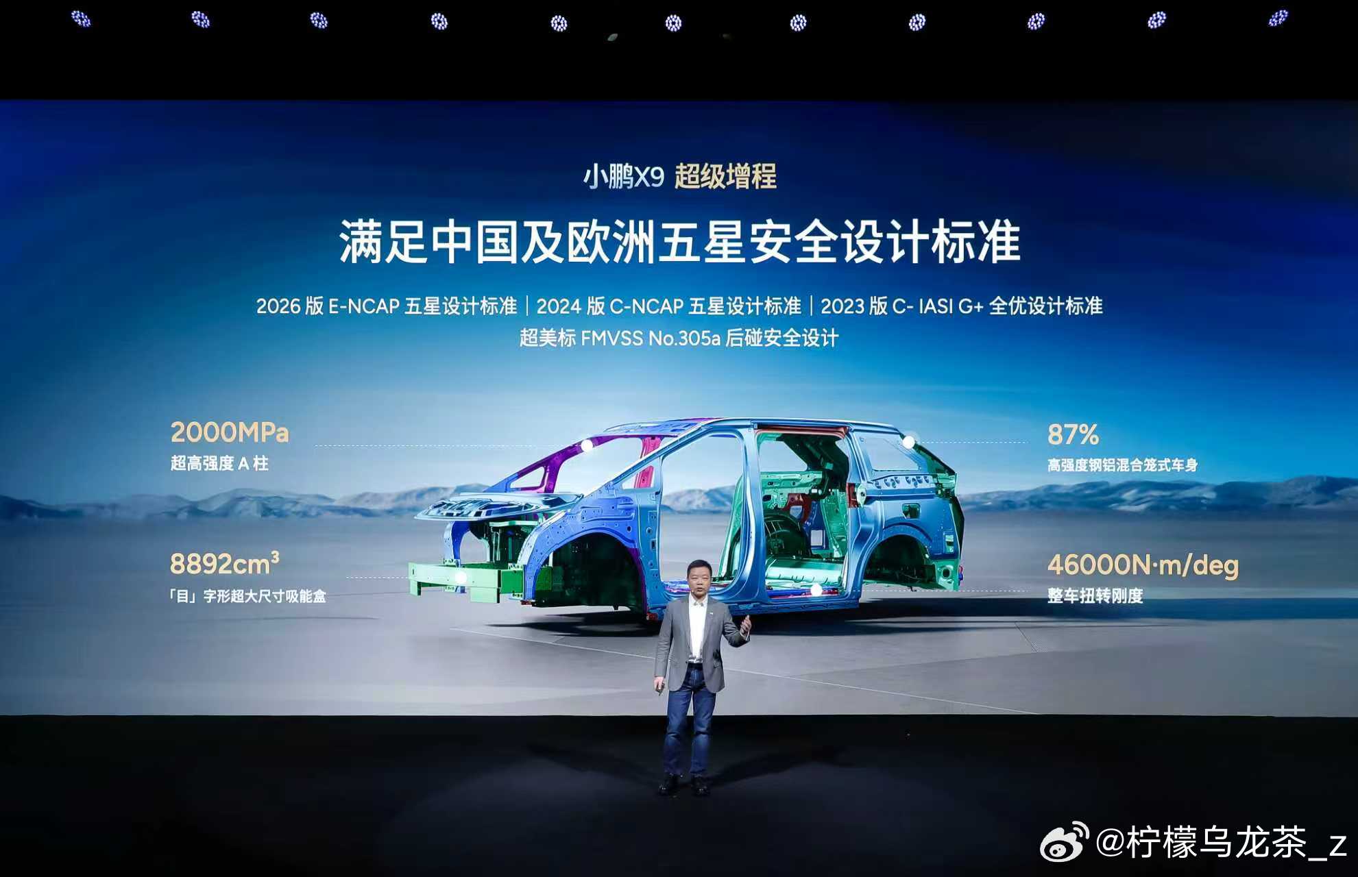 小鹏X9超级增程满足中国及欧洲五星安全设计标准,采用87%的高强度钢铝混合笼式车身,2000MPa超高强度A柱。车头拥有超大的8892m³目字形吸能盒,能够在碰撞意外发生时最大程度保护乘员舱安全。