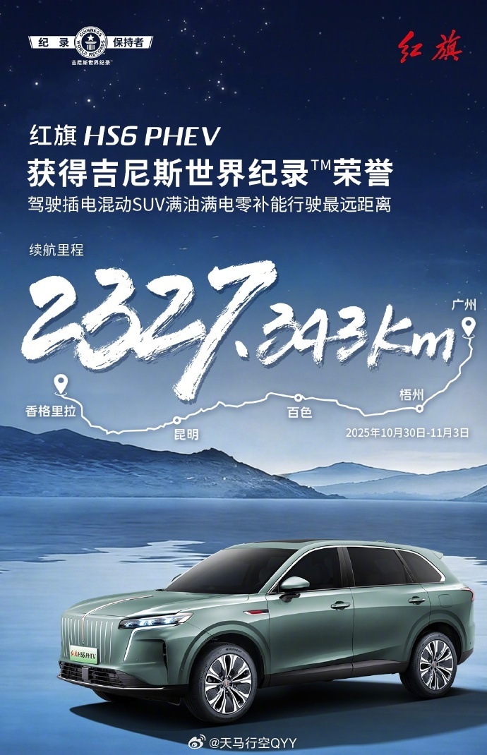 最近关注到红旗HS6 PHEV 的一个大新闻——它居然拿了个吉尼斯世界纪录,实测续航直接冲到了2327公里多。说实话,第一眼看到这数字我也愣了下,这续航,确实有点东西。