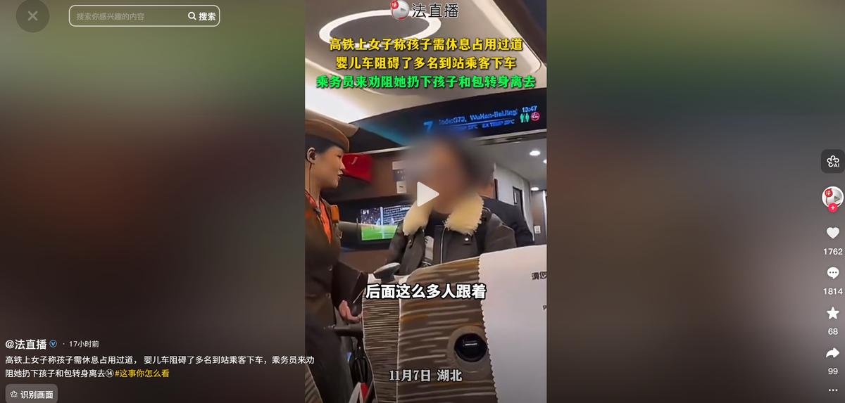 到北京的某高铁中途到站,大家都在排队下车,结果,一女子推着婴儿车,强行堵住下车通道,多人排队等待下车,让她先让一让,可女子说什么都不愿退让,工作人员再三劝说,女子却把包一扔:“你想怎么弄就怎么弄”。然后转身离去,连孩子都不管了。 事情说起来不复杂,就是一趟高铁中途到站,大家都按规矩排队准备下车,没想到一个女子推着婴儿车,直接堵在了下车通道的正中央,任谁劝说都不肯挪地方,最后还做出了让人意想不到的举动。 了解高铁的人都知道,中途站点的停靠时间特别短,一般就两三分钟有时候甚至不到两分钟,大家都得抓紧时间上下车,尤其是要换乘的乘客,一分一秒都耽误不得。 那天列车刚停稳,车门打开,准备下车的乘客就自觉排起了队,可走到通道中间就被拦住了,一个戴眼镜、看起来挺斯文的女子,推着一辆婴儿车停在那儿,正好把唯一的通道堵得严严实实,后面的人想过都过不了。 排在前面的几位乘客都急坏了,有提着大行李箱的男士,还有背着背包赶换乘的年轻人,大家都小声跟女子商量,能不能先把婴儿车挪到旁边一点,让大家先下车,毕竟停站时间有限,耽误了就赶不上后续的行程了。 可不管大家怎么好言相劝,女子就是不为所动,嘴里念叨着 “孩子在这儿呢,不能动”,还说要是挪动的时候不小心磕着碰着孩子,谁能负得起这个责任。 可旁边有细心的乘客发现,婴儿车里的孩子根本没睡觉,反而睁着眼睛在里面活泼地玩着,压根不像女子说的那样经不起挪动,大家心里都清楚这不过是她不愿让路的借口罢了。 有乘客忍不住嘀咕:“带娃不容易我们都能理解,可也不能凭着这个就霸占公共通道啊,大家的时间都很宝贵。” 还有人说,自己也带过孩子坐高铁,每次到站前都会提前把东西收拾好,主动挪到门口附近,就怕耽误别人上下车,都是带娃的怎么差距就这么大呢。 眼看着停站时间越来越近,后面的乘客也开始着急起来,队伍里的抱怨声越来越大,这时候铁路工作人员也赶了过来,一边安抚排队的乘客,一边耐心地跟这位女子沟通,跟她解释高铁停站时间短,堵着通道会影响所有乘客的通行,还违反了铁路的相关规定,要是执意不配合,可能还得承担相应的责任。 可工作人员好话说了一箩筐,女子的态度反而越来越强硬,根本不把规则放在眼里,最后她干脆把自己的背包往地上一扔,撂下一句 “你想怎么弄就怎么弄”,然后转身就往车厢里面走,竟然把婴儿车和车里的孩子就这么扔在了通道中间不管不顾了,这一举动让在场的所有人都惊呆了,大家没想到她会这么极端,为了赌气连孩子都不管了。 工作人员也被这突如其来的状况弄得有些手足无措,一边得赶紧处理通道堵塞的问题,一边还得照看留在婴儿车里的孩子,生怕孩子出什么意外。 没办法为了让后面的乘客能顺利下车,工作人员只能先把婴儿车小心翼翼地挪到车厢旁边的空位上,赶紧疏通了通道,直到列车快要关门的时候,那位女子才慢悠悠地回来,抱起孩子推着车离开,全程没对被耽误的乘客说一句道歉的话。 这件事被乘客拍下来发到网上后,很快就引起了热议,网友们几乎一边倒地批评这位女子的做法,大家都觉得带娃不易确实是事实,但这绝对不能成为无视公共规则、妨碍他人的理由,公共通道是大家共用的,不是某个人的私人空间,每个人都有义务遵守规则互相体谅。 有人说这位女子看似斯文,实则自私自利,把孩子当成了自己搞特殊、耍特权的挡箭牌,这种行为不仅影响了其他乘客,更给孩子做了不好的榜样,真正爱孩子应该是教会他尊重他人、遵守规则,而不是让他觉得自己可以凌驾于规则之上。 还有人说高铁是公共空间,需要每个人的自觉维护,要是都像这位女子这样,只顾自己不顾别人,公共秩序早就乱套了。 其实道理很简单,公共空间的和谐有序,靠的是每个人的相互包容和对规则的敬畏,带娃出行确实会遇到各种不便,但只要多一点换位思考,多一份自觉,很多矛盾都能避免。 比如提前规划好上下车的时间,主动为他人让路,这些小小的举动,就能让出行变得更顺畅,希望这件事能给大家提个醒,不管什么时候都别让自私打败了公共意识,毕竟遵守规则才是对自己和他人最好的尊重。 (信息来源:法直播)
