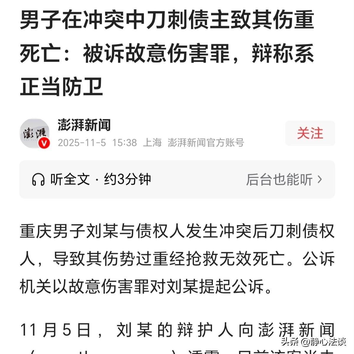 重庆,一男子输光积蓄后,以每日600元的利息借了30000元想翻本,没想到又输个精光,到了还钱的日子傻眼了,债主约他谈还钱的事,俩人一见面就吵起来,债主持刀想吓唬他还钱,拉扯中刺伤其手指,男子反击后想跳车逃离,却被债主死死拽住不放。情急之下,男子持刀连续捅刺债主上半身,致其死亡。案发后,男子坚称是正当防卫,公诉机关却以故意伤害罪起诉! 2025年1月26日晚,年味渐浓,刘某却东躲西藏没心思过年,就怕讨债的上门,债主张某又打来电话约见面。 实在没办法,这事不处理年都不好过,刘某赶到张某约定的地点,见张某坐在车里等他,就开门坐在副驾驶上。 没说几句两人就吵起来,刘某欠的3万元债务一直还不上,马上过年了,今天得给个给钱。 刘某好赌,欠了一屁股债,根本没钱还,他求张某再宽限几天,不是不给,真没有钱。 张某怒火中烧,你没钱还,当初为啥要借,我的钱也不是大风刮来的,想赖账吗? 他从车内扶手箱掏出刀具,想吓唬刘某还钱,对着副驾驶的刘某刺去。 刘某慌忙用手抵挡,右手大拇指瞬间被划出血口,疼痛与恐惧瞬间涌上心头。 他要求张某送自己去包扎,却遭到对方的言语攻击与持续威胁,张某甚至再次举起了刀。 生死关头,刘某掏出了随身携带的单刃刀,抢先一步刺向张某,随后试图跳车逃离,却被张死死 拽住衣角不放。 撕扯中,车辆停下后,刘某竟将张某整个人拖下车,而张某仍不松手。 刘某情急之下,持刀对着张某上半身连续捅刺,直到对方倒在地上,他才幡然醒悟。 急忙报警并呼叫救护车,可张某最终还是因抢救无效死亡。 事情还得从2024年8月说起,刘某输红了眼,为了往回翻本,向张某借了3万元。 二人约好,一万元每日200元的离谱利息,3万元一天利息就600元,刘某当时一门心思翻盘,根本没想后果。 到期后傻眼了,他嗜赌成性,四下借钱,压根无力偿还。 张某也不是吃素的,欠帐还钱,天经地义,他天天找刘某要钱,甚至刘某家人也被骚扰。 同年10月,张某带人跟踪、蹲守刘某家门口,刘某不敢出门,家人也心惊胆战,无奈报警,对方一看帽子叔叔来了就走了,问题未解决,过后还来。 更让他心惊的是,期间另一位债主薛某找上门,好容易堵住他,一要钱没有,不管三七二十一持刀将他暴揍。 刘某深知自己欠债太多,保不齐哪天挨打,为了自保,吓得买了单刃刀防身。 案发后,刘某坚称自己是正当防卫,但警方以涉嫌故意伤害罪将其控制,公诉机关也以此罪名提起公诉。 一失足成千古恨,刘某追悔莫及,但他坚持称当时情况危急,自己是正当防卫。 有人说,张某先持刀伤人,刘某反抗是自保,若不反击,倒下的可能就是自己。 也有人认为,张某下车后仅撕扯衣服,并未继续伤人,刘某的连续捅刺已超出防卫范围,属于故意伤害。 那么,从法律的角度,该如何看待这件事呢? 《刑法》第20条:为了使国家、公共利益、本人或者他人的人身、财产和其他权利免受正在进行的不法侵害,而采取的制止不法侵害的行为,对不法侵害人造成损害的,属于正当防卫,不负刑事责任。 正当防卫明显超过必要限度造成重大损害的,应当负刑事责任,但是应当减轻或者免除处罚。 张某刚开始持刀刺向刘某,致其手指受伤,并持续进行言语攻击和威 胁,刘某此时掏出刀具反击,属于正当防卫。 但当双方撕扯至车外后,张某从“持刀威胁”转变为拽住衣角不放,不再属于严重危及人身安全。 而刘某此时持刀连续捅刺张某上半身并致其死亡,超出防卫手段与不法侵害的程度的必要限度,可能构成防卫过当。 《刑法》第234条:故意伤害他人身体的,处三年以下有期徒刑、拘役或者管制。犯前款罪,致人重伤的,处三年以上十年以下有期徒刑;致人死亡或者以特别残忍手段致人重伤造成严重残疾的,处十年以上有期徒刑、无期徒刑或者死刑。 刘某明知持刀连续捅刺张某上半身,会造成严重伤害甚至死亡结果,仍实施该行为,具有伤害的故意。 他的捅刺行为直接导致张某死亡,属于“故意伤害他人身体致人死亡”的情形。 刘某的行为超出正当防卫限度,其反击已转化为非法伤害行为,构成故意伤害罪。 目前,此案在进一步侦办中。 刘某嗜赌成性,输光积蓄还高利息借钱翻本,这本身就走了歪路。 欠债还钱是本分,但他没想着好好解决,反而一直逃避,这为后续的冲突埋下了隐患。 而债主张某,明知是高利息还出借,讨不到钱就用持刀威胁。 还骚扰家人的极端方式,甚至先动手伤人,这种讨债手段本就违法,也彻底激化了矛盾。 最让人惋惜的是,刘某一开始被伤害时反击,或许还有正当防卫的可能。 但后来张某只是拽着他不放,已经没有严重的人身威胁,他却情绪失控连续捅刺,最终酿成大祸。 这也提醒我们,遇到矛盾千万别冲动,更不能用暴力解决问题。 对此,你怎么看呢? @静心法谈 学法辨是非,慬法不吃亏。