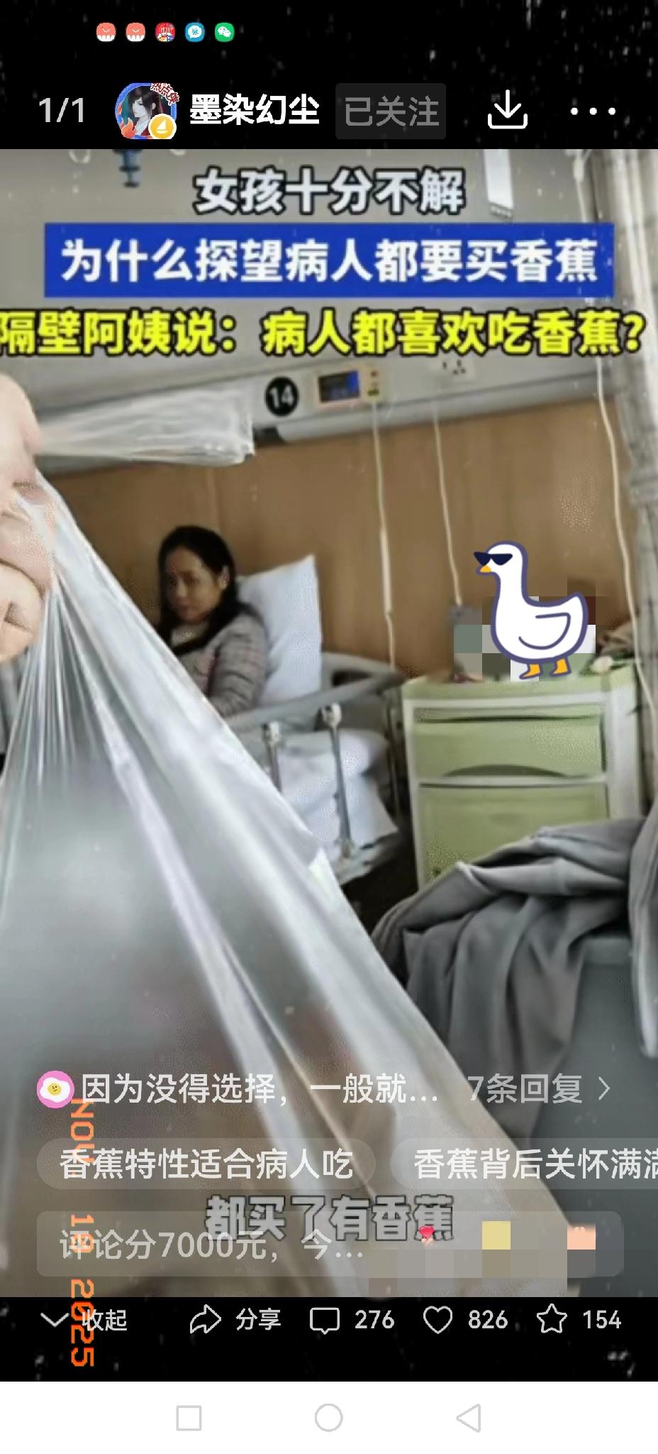 女子生病住院,每天都有香蕉吃。突然她问隔壁床阿姨: “为什么来看病人的都买香蕉?”隔壁床阿姨说: “看病人不买香蕉买什么,病人都喜欢吃香蕉。” 可女子心里犯嘀咕,香蕉坏得快,自己吃一半扔一半,刚吃完又有新的续上,出院后简直要对香蕉PTSD。其实探病选香蕉,早就是刻在大家骨子里的默契,不只是图方便。 软糯不费牙、不用洗不用切,肠胃弱的病人也能轻松吃,还能补钾补维生素,这些实用优点咱都懂。更妙的是“蕉”谐音“招”,藏着把健康“招”回来的吉利意思,比寓意“离”的梨讨喜多了。价格实惠全年能买到,提一串还好看,一人一根分着也方便,简直是探病礼物的“六边形战士”。 不过再好的东西吃多了也腻,偶尔换点芒果、猕猴桃这类软质水果,新鲜感更足。你探病时必带香蕉吗?还有哪些比香蕉更贴心的探病好物?来评论区分享下~