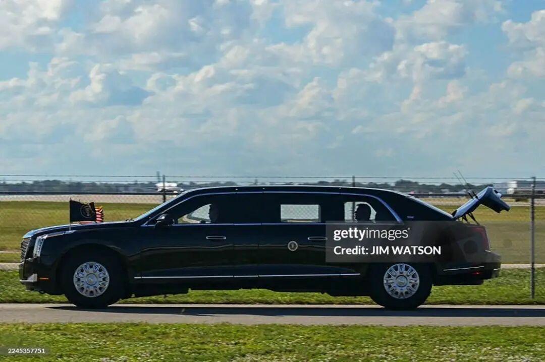 特朗普周日早些时候前往棕榈滩国际机场时,他的总统座骑“野兽”的后备箱竟然是开着的