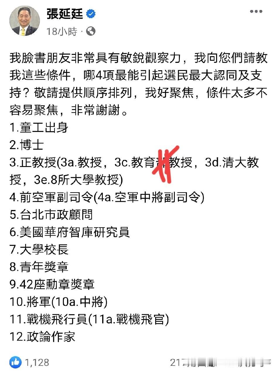张延廷将参选台北市议员!询问网友用何头衔参选! 台湾省前空军中将副司令,名嘴张延廷退休后经常上电视评论时政军事成了网红名嘴,此外他还担任国民党台北市党部副主委。尽管退休了许久,但他从政热情不减,最近他为参选2026年台北市议员做了很多准备工作,他盯上了中正万华选区的议员,昨天大半夜发文问他粉丝,他应该用什么头衔参选才能引起选民的认同支持。 这老头竟然给自己列了12个头衔问网友,笑死了挺逗的。