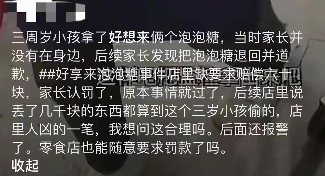一切还是要靠证据说话。如果3岁的幼童真的偷了那么多东西,而且天天到超市去偷,那家长就需要赔偿,更需要依法依规处理;如果幼童没有天天去偷,也没有偷那么多东西,那超市就要承担造谣污蔑的责任,就要赔偿幼儿及其家长的名誉损失。按照谁主张谁举证的原则,超市应该拿出他们的监控录像,一切用事实说话,并且还可以报警处理。作为这么一个大型的品牌,好想来如果污蔑孩子那就是大事了。