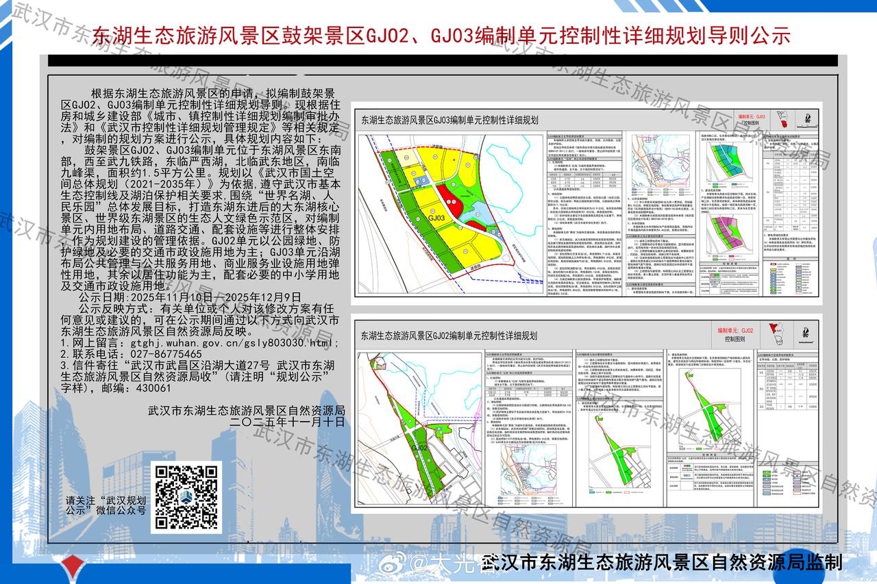 东湖鼓架景区GJO2、GJ03编制单元控制性详细规划出炉! 11月10日,东湖生态旅游风景区自然资源局根据申请拟编制鼓架景区GJO2、GJ03编制单元控制性详细规划导则。 鼓架景区GJO2、GJ03编制单元位于东湖风景区东南部,西至武九铁路,东临严西湖,北临武东地区,南临九峰渠,面积约1.5平方公里。规划以《武汉市国土空间总体规划(2021-2035年)》为依据,遵守武汉市基本生态控制线及湖泊保护相关要求,围绕“世界名湖、人民乐园”总体发展目标,打造东湖东进后的大东湖核心景区、世界级东湖景区的生态人文绿色示范区,对编制单元内用地布局、道路交通、配套设施等进行整体安排,作为规划建设的管理依据。GJ02单元以公园绿地、防护绿地及必要的交通市政设施用地为主;GJ03单元沿湖布局公共管理与公共服务用地、商业服务业设施用地弹性用地,其余以居住功能为主,配套必要的中小学用地及交通市政设施用地。 公示日期:2025年11月10日—2025年12月9日