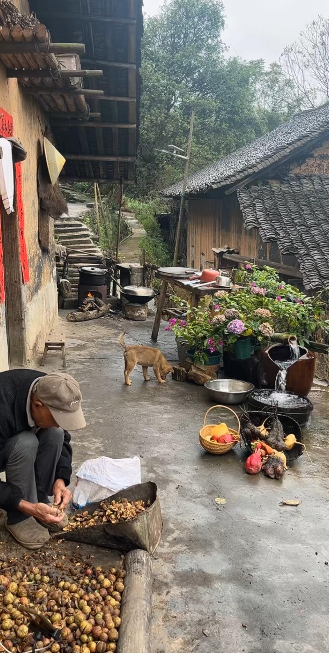这是来自一位山里人的直播间 从图中可以看到周围大山环抱 雨后空气十分清新 山泉水源源不断地流淌着 生活那叫一个惬意 .