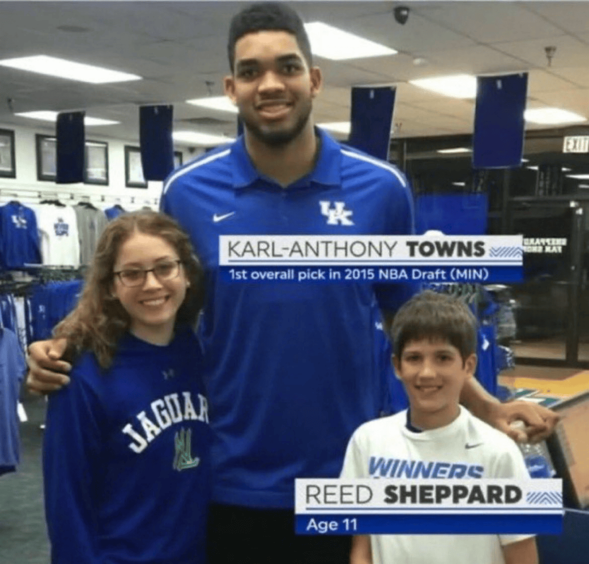 该照片拍摄时卡尔-安东尼-唐斯还在效力于肯塔基大学,谢泼德的父母也都是前肯塔基大学篮球运动员。