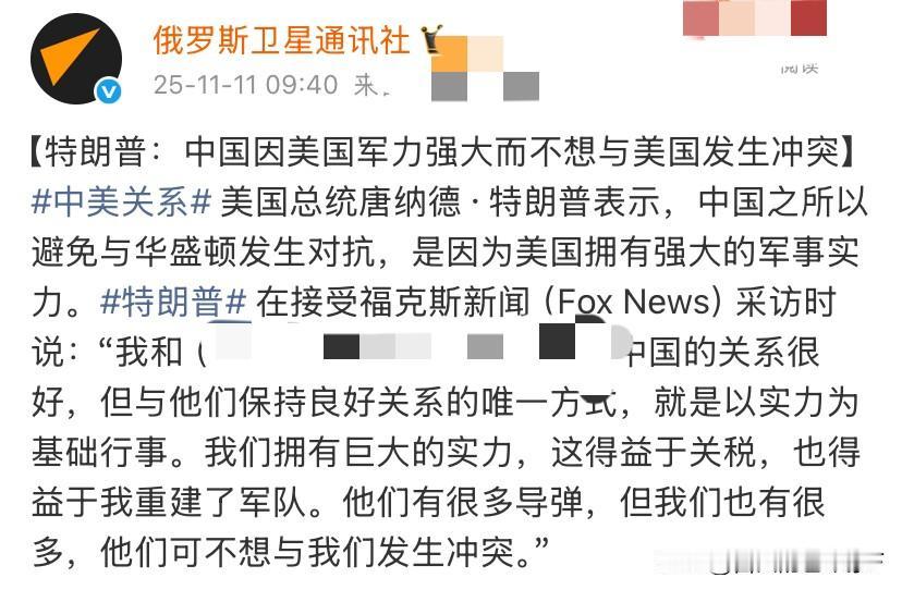 美国总统特朗普在(11月10日)叫嚣:中国因美国军力强大而不想与美国发生冲突。 11月10日特朗普在接受福克斯新闻采访的时候表示美国和中国的关系非常的好,和中国保持良好的唯一方式,就是以实力为基础,而美国之所以能够拥有巨大的实力,全都得益于他所征收的关税 关税让美国人重建了军队,所以即便是中国有很多的导弹,但是美军的强大,让他们依旧不想和美国发生冲突 评论2句:回顾特朗普2.0关税的政策其主要目的是为了扩大制造业就业,提高美国的总产出、缩小美国的贸易逆差 但是经过将近半年的测试,美国并没有从中得利,反倒是提高了美国的通胀,增加了普通民众的生活成本,引发了美国民众的反对,加速了美国经济衰退,现在所有人都对特朗普的关税恨得咬牙切齿,特朗普虽然叫停了关税,但是嘴上却不愿意认输,不断地为自己的关税摇旗呐喊强调关税能让美国强大。这种没有实际数据支撑的呐喊看起来让人感觉到格外的苍白无力,更像是一个不得志的人无能狂怒的呐喊