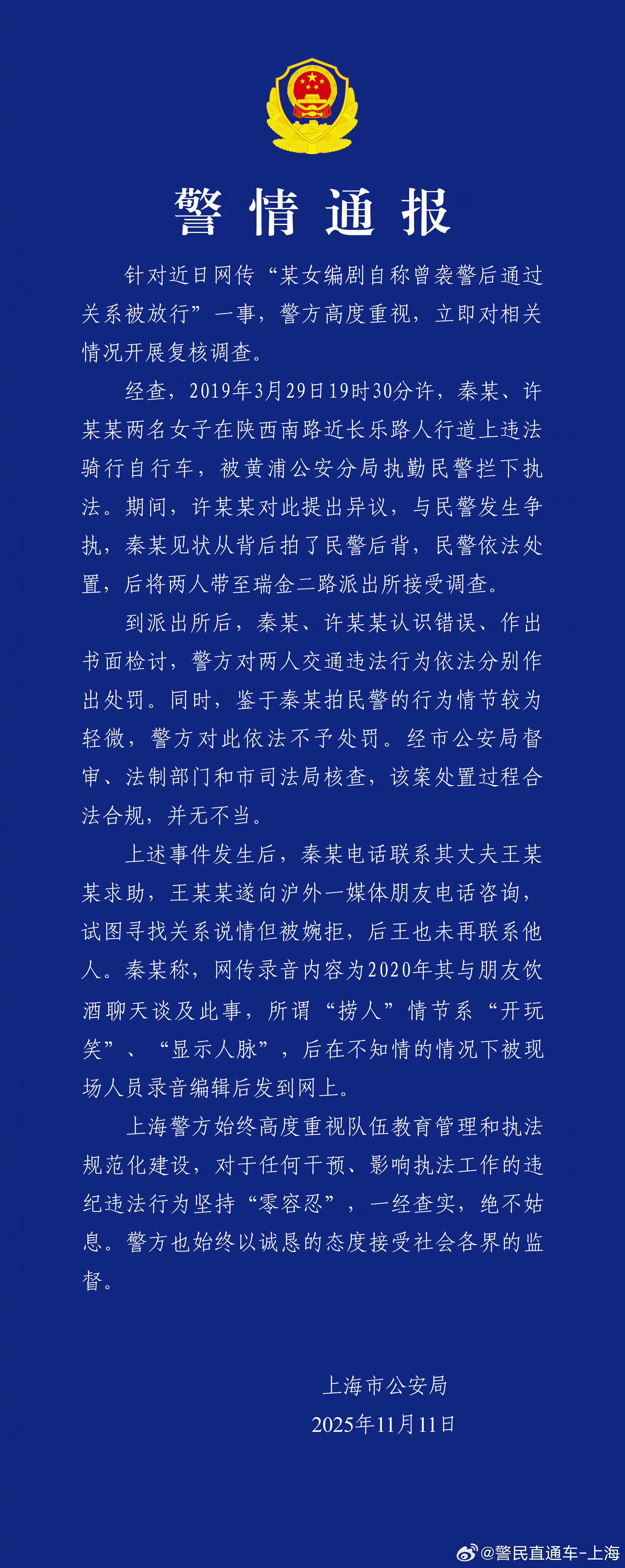 警方回应秦雯袭警后通过关系被捞出来是“开玩笑”“显示人脉” ,没有袭警只是“拍”了一下背