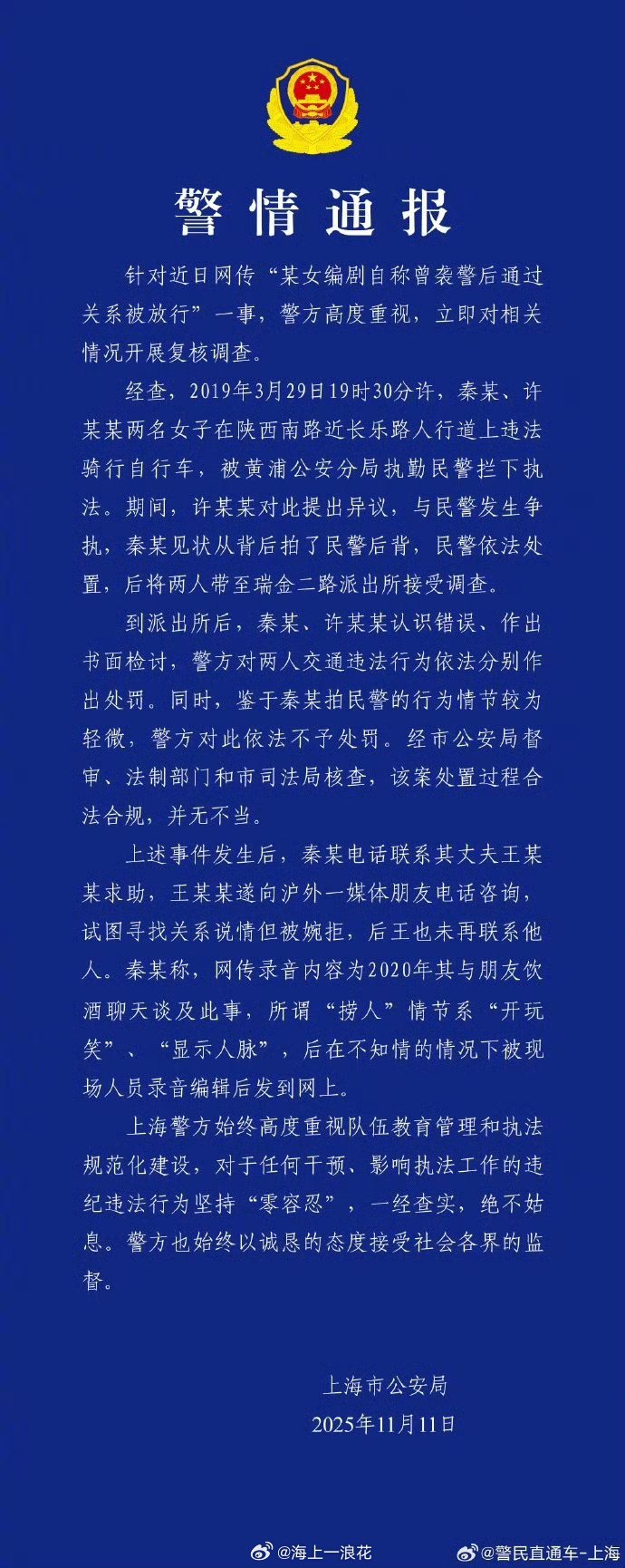基于这样的法律标准,在绝大多数情况下,这类轻微的肢体冲突或言语争执,都不太可能构成“袭警”行为。秦雯自称袭警捞人系开玩笑上海身边事