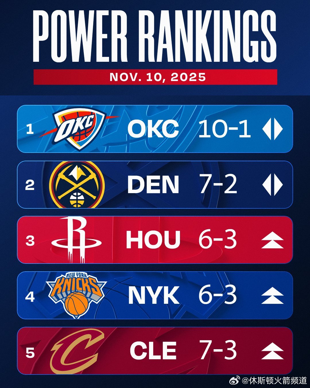 NBA官方实力榜火箭上升一位来到第三,仅次于雷霆掘金。休斯顿火箭