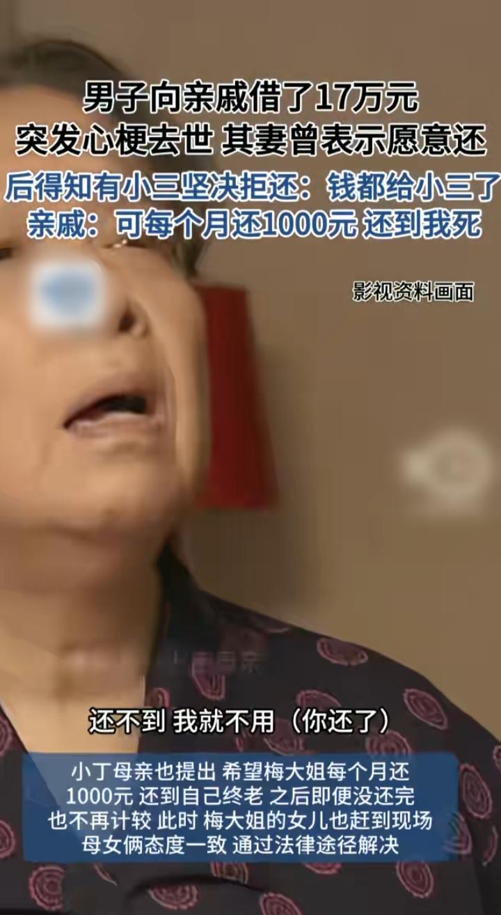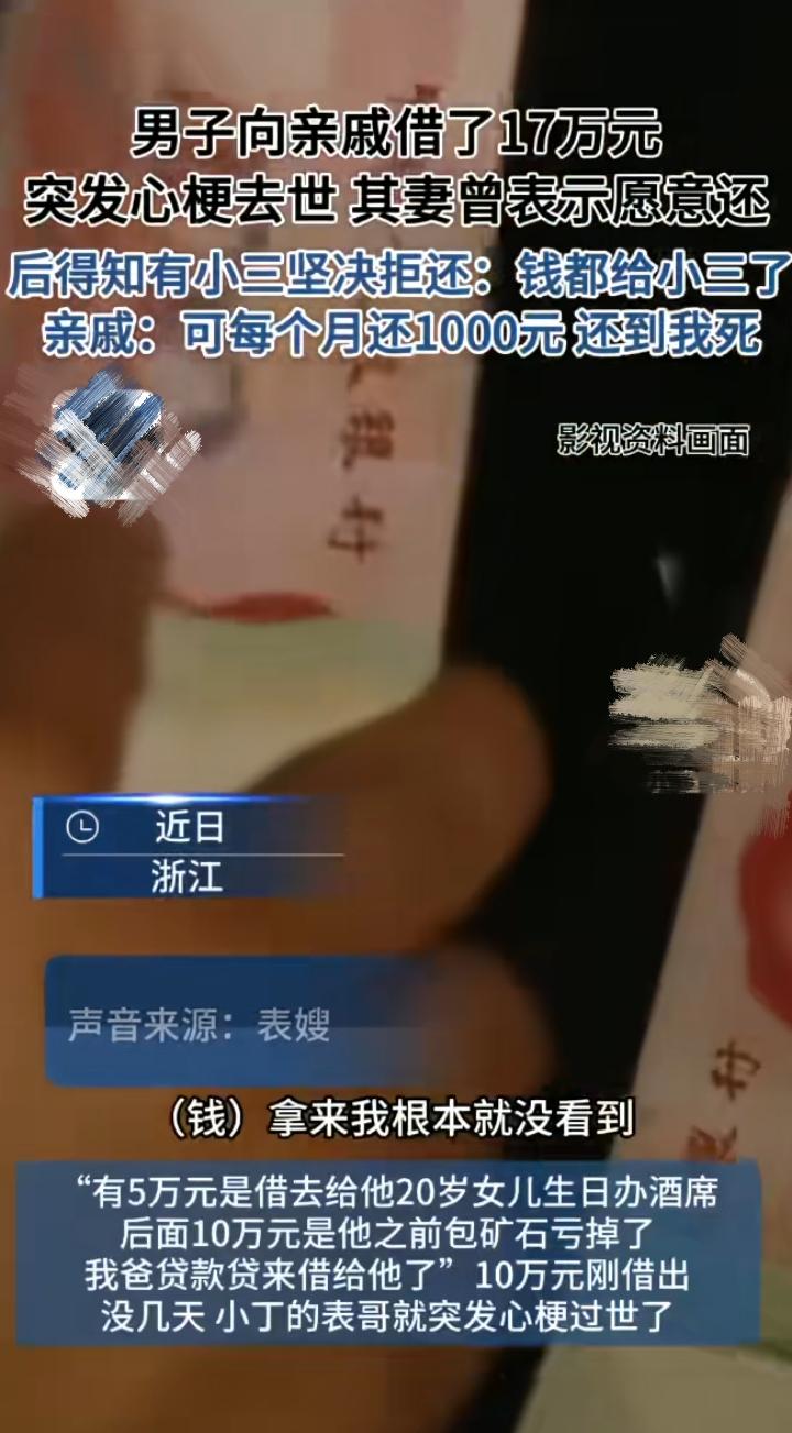 男子突发心梗去世,留下17万元债务,最可怜的是借他钱的亲戚和他毫不知情的妻子 亲戚找上门时,妻子开始表示愿意还这个钱的,可不久她发现了一件扎心的事,丈夫早就在外有了小三!这些她不知情的债务,不知道多少是花给小三了,她气愤不已,不愿意再还钱。 亲戚更是无辜,他们也是小本生意,借给男子的钱是他们辛苦攒下的积蓄。现在男子去世,他妻子又不愿承担债务,他们协商,让妻子每月还1000元,慢慢还就行。 妻子气愤又心痛,丈夫借的钱并没有用到家里,她和女儿表示,一定要通过法律途径来解决这件事。 我赞成她们的做法,通过法律途径,向小三追责,婚姻存续期间给小三的钱可以要回来的,钱追回来,她的心里能好受些,给亲戚也有个交待。 图片取自网络