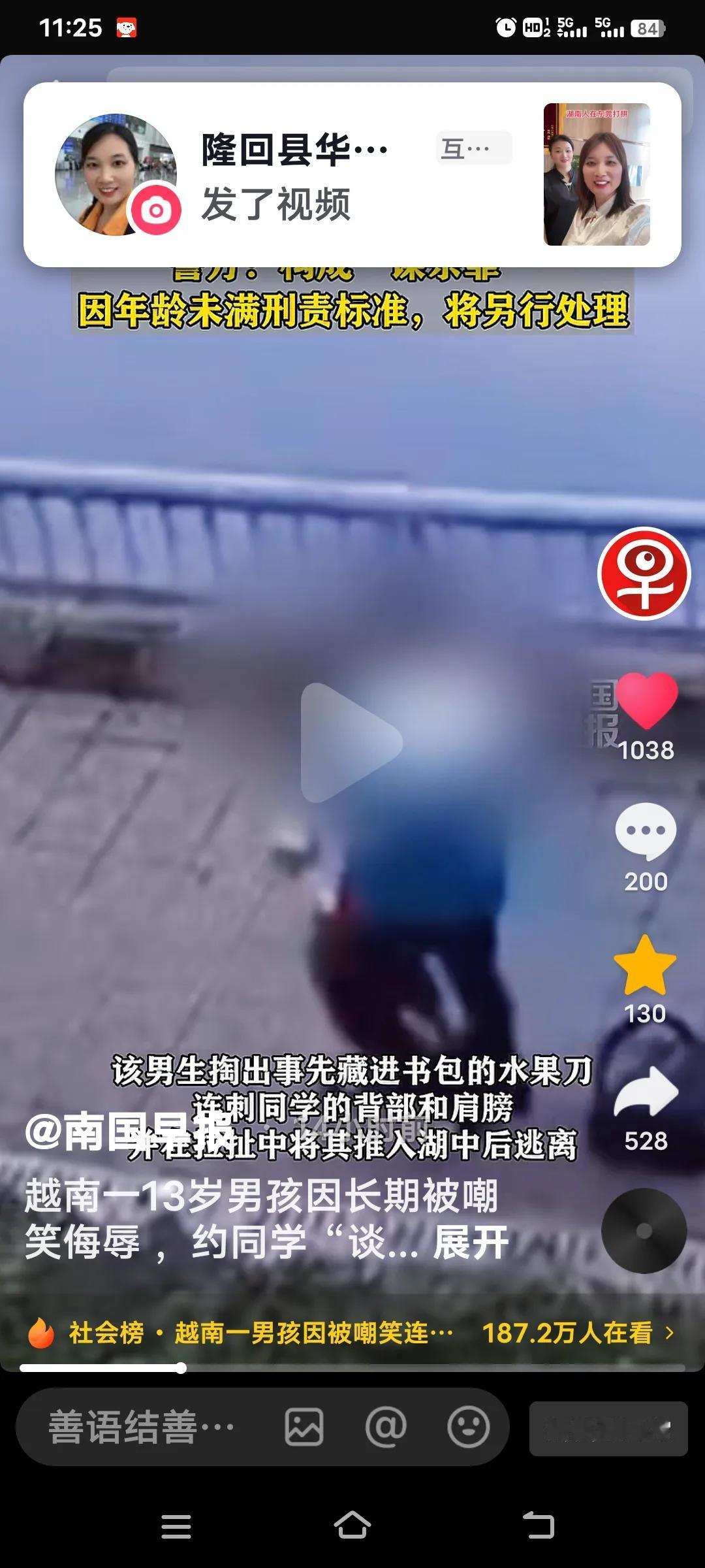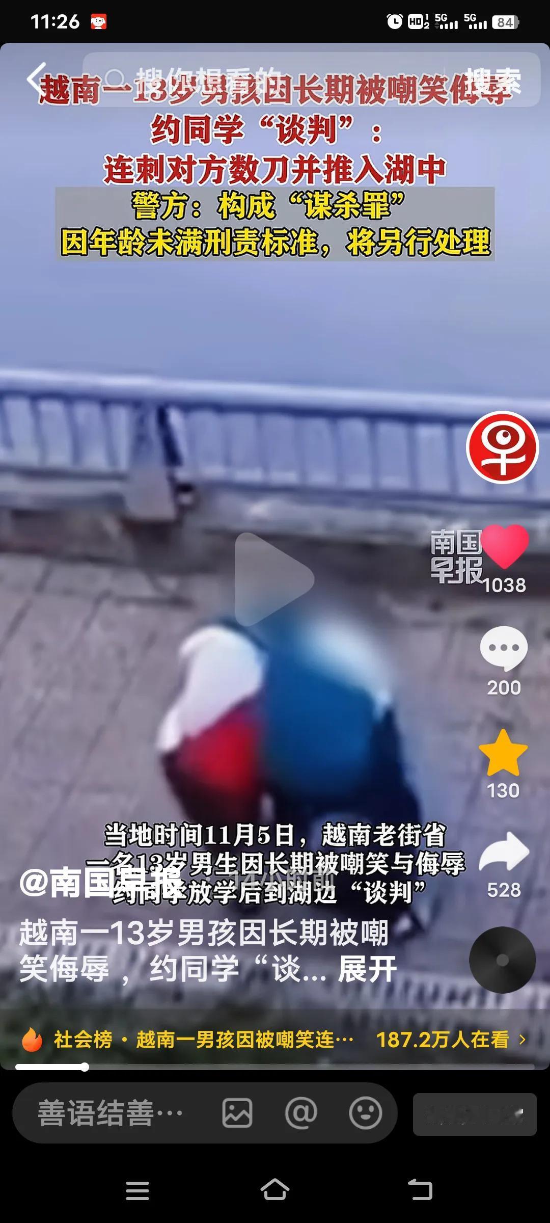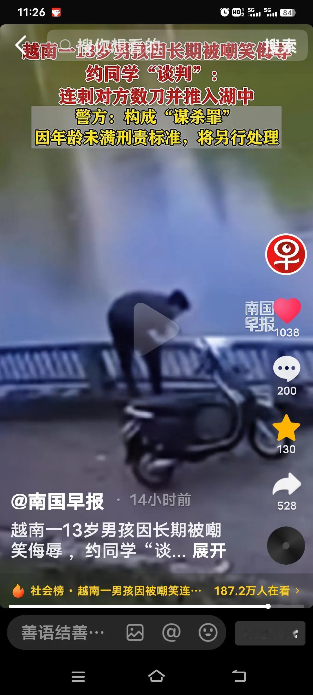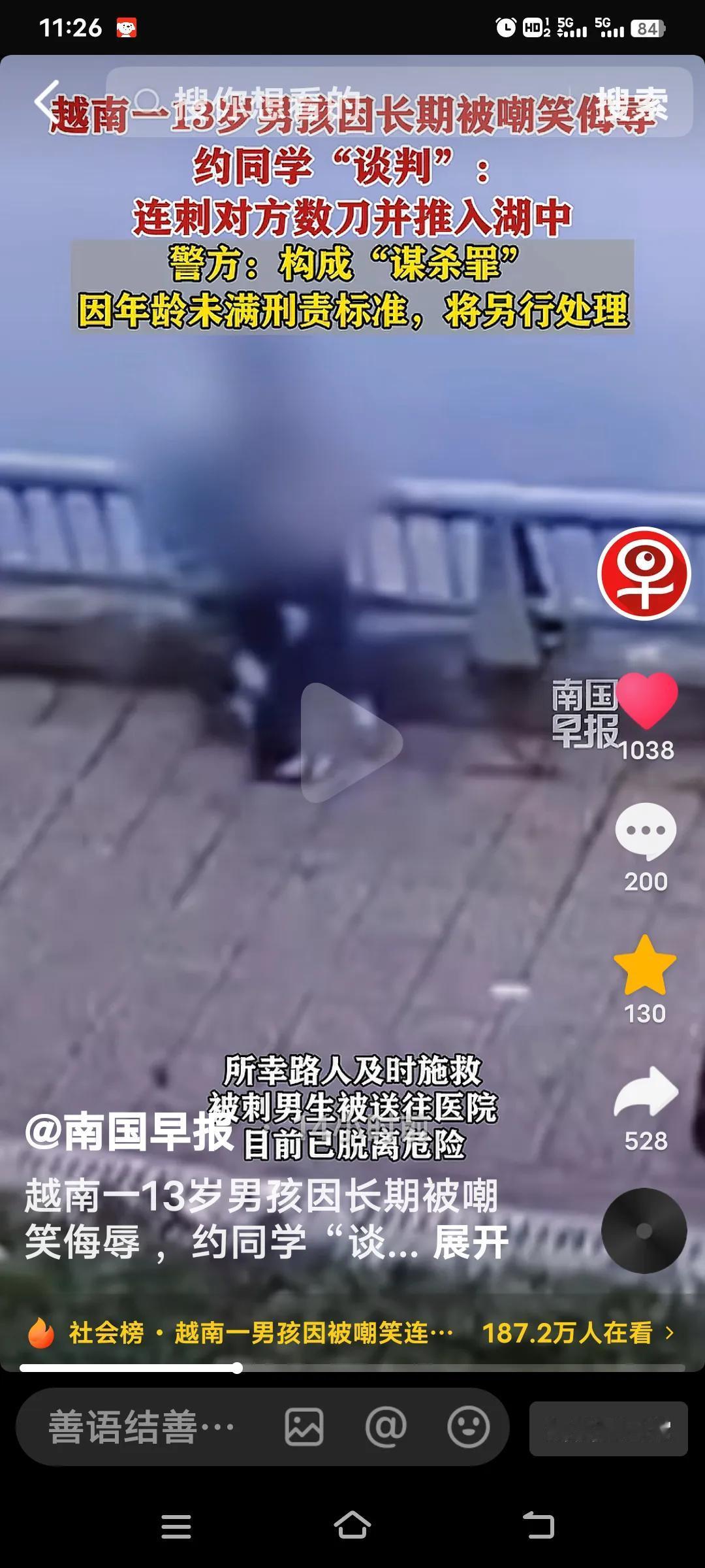 别把老实人逼急了,每个人都有自己的脾气!看看这个学生你就明白了! 越南老街省有一名13岁的男同学,长期遭受他人的嘲笑与侮辱。当地时间11月5日,他约同学到湖边“谈判”。到了湖边后,他掏出事先准备好的水果刀,连刺同学的背部和肩部,在拉扯过程中还将同学推入水中,随后离去。好在有路人看到,将被刺的同学送往医院抢救,这才让其逃过一劫。 据报道,事发前该同学曾提醒对方,不要嘲笑自己,更不要侮辱自己的家人,却遭到拒绝。看来他是被逼急了,想给对方一点教训。评论区瞬间炸开了锅,有人甚至说早知道不如直接害死对方。 警方调查认定,这位13岁男生犯故意“谋杀罪”,但由于其年龄未满18岁的刑责标准,将另行处理。 话再说回来,他实在是忍无可忍了!嘲笑他也就罢了,还侮辱他的家人,换做谁都难以忍受。说到底,这个13岁的男生也不是好惹的,并非那么容易被拿捏。也希望对方能够悔改,从中吸取教训,不要再嘲笑他人了。 论别欺负老实人 脾气 脾气的来源