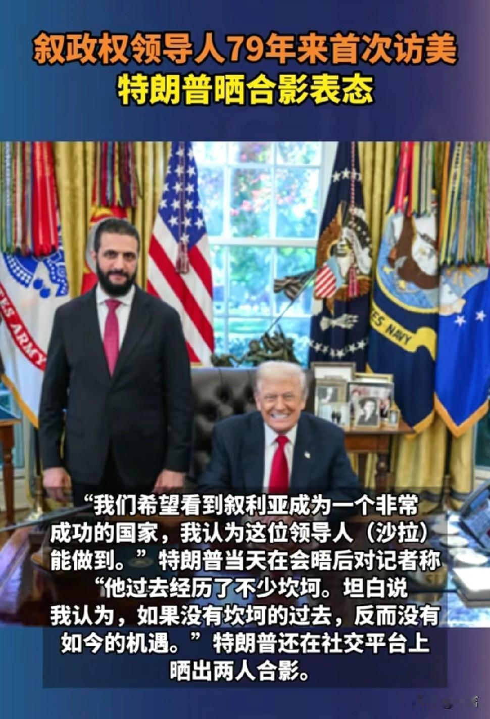 特朗普和沙拉达成重要协议:美国将全力支持叙利亚发展经济。从被美国1000万美元悬赏的通缉犯到白宫坐上宾,沙拉只用了10个月的时间。 2025年11月10日,叙利亚临时总统沙拉访问美国与特朗普举行会晤,这是1946年以来叙利亚领导人第一次正式访问美国。也沙拉是2025年1月29日就任叙利亚临时总统以来第三次和特朗普会面。 会面达成的共识包括: 叙利亚驻美大使馆将重新开放 美国支持叙利亚国家统一, 美国为叙利亚重建和发展提供必要支持 美国将解除对叙利亚的制裁。 得让叙利亚融入国际社会,沙拉都做了什么? 叙利亚和打击极端组织“伊斯兰国”的国际联盟签署了一份合作宣言,彻底与恐怖主义划清界限 沙拉承诺“三年内推出宪法,四年内举行选举,自己不会谋求长期执政,保证叙利亚媒体私有化”
