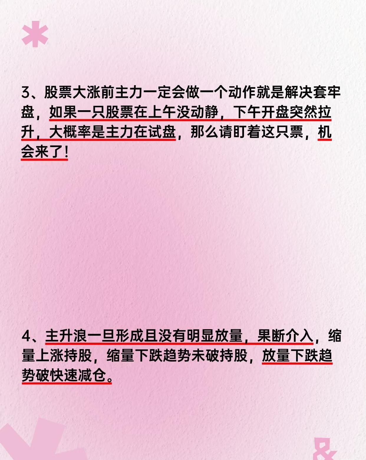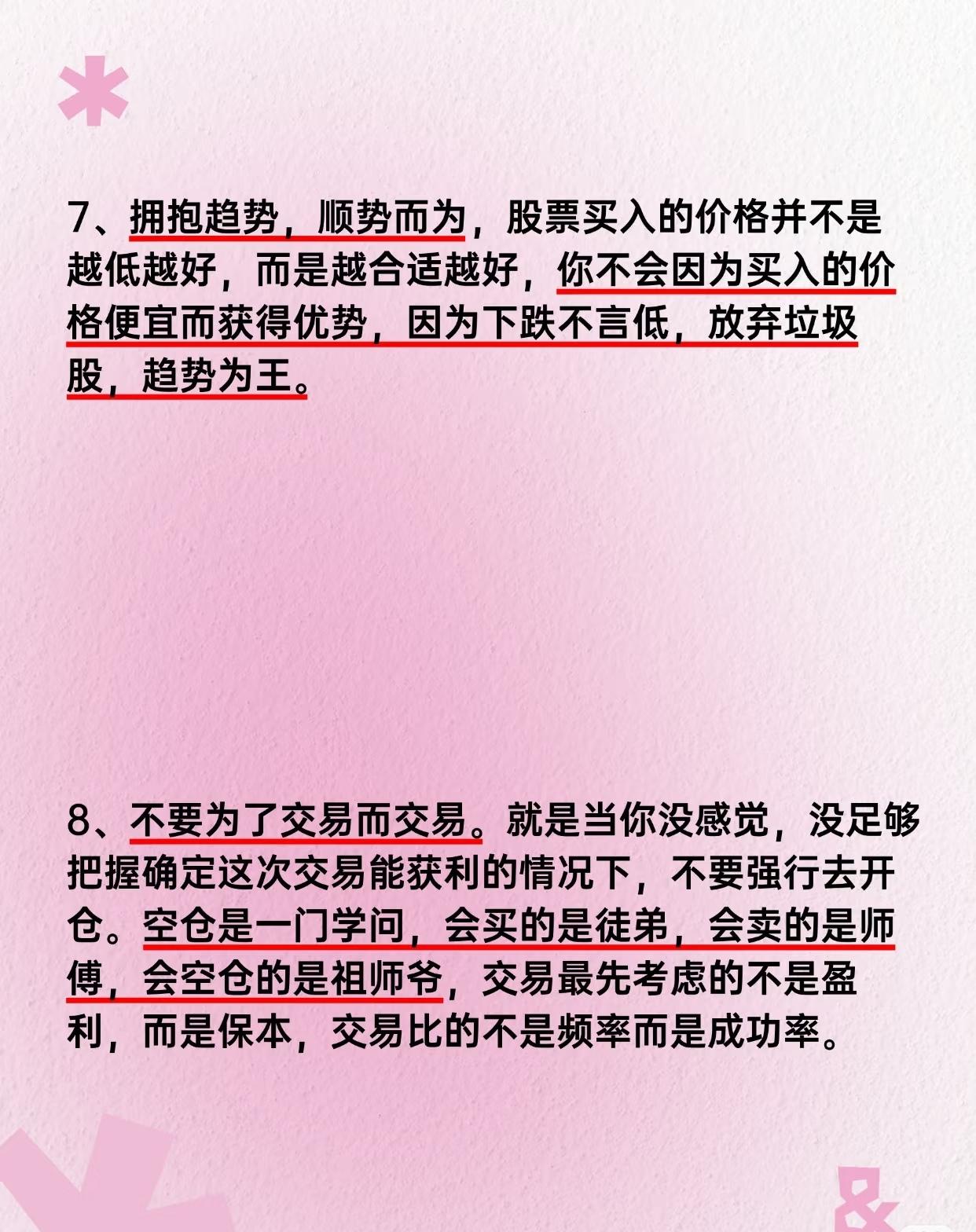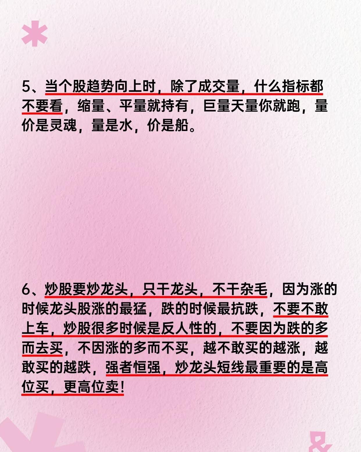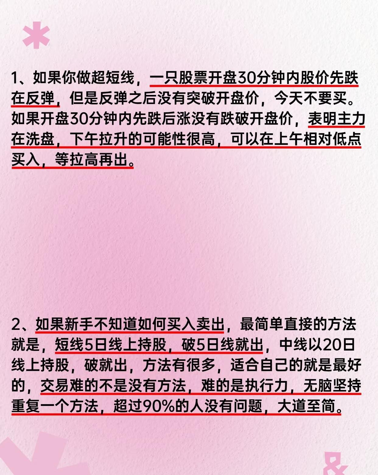 关于股市投资技巧与投资心态的精华总结:主要面向小资金投资者、短线及中线交易者,内容通俗易懂,重点突出,以“安全稳健、大道至简、顺势而为”为核心理念,下面我为您系统梳理和归纳其中的核心投资要点,方便您理解和实践: 📈 一、总体投资理念与心态(核心基础) 1. 投资成功关键在于“自控”与“认知” - 第9条:外不可控,内求于己 不要将亏损归咎于市场或他人,对自己的交易决策负全责,只有敢于面对错误,才能不断进步、避免重复踩坑。 - 第10条:当走势超出你的认知,离场! 如果你看不懂当前股票的走势,感到迷茫或走势不符合预期,最佳策略就是暂时离场,保护本金,等待看得懂的机会再出手。 ✅ 核心思想:投资先修心,勇于认错、学会放弃,是长期生存的第一步。 💡 二、买入策略与择时技巧(实操核心) 2. 最安全稳健的买入法 “最安全稳健的买入法,很简单却很赚钱”——强调方法不在复杂,而在有效、可执行、适合自己。 3. 超短线操作技巧 适用于喜欢做T+0或当天进出的短线投资者: - 开盘30分钟观察法: - 先跌后反弹,但未突破开盘价 → 当天不宜买入 - 先跌后涨,且未跌破开盘价 → 主力可能在洗盘,可考虑在上午低点买入,午后拉升时卖出 ✅ 关键点:观察开盘30分钟内的价格行为,判断主力意图,把握低吸高抛节奏。 4. 均线买卖法则(适合新手,第2张图第2点) “大道至简,执行力才是关键” - 短线(5日线法则): - 股价在5日均线之上 → 持有 - 跌破5日均线 → 卖出 - 中线(20日线法则): - 股价在20日均线之上 → 持有 - 跌破20日均线 → 卖出 ✅ 无论哪种周期,找到适合自己的均线系统,坚持执行,就能战胜大多数投资者。 5. 主升浪与主力行为观察 - 主力试盘信号: - 股票上午平淡,下午突然拉升 → 很可能是主力在试盘,意味着机会来临,值得重点关注! - 主升浪介入原则: - 主升浪形成且没有明显放量 → 果断介入 - 缩量上涨 → 持股 - 缩量下跌但趋势未破 → 继续持有 - 放量下跌且趋势破坏 → 快速减仓 ✅ 抓住主升浪的核心:一看趋势,二看量能,三要果断。 🏆 三、选股与持仓策略(选对股,拿得住) 6. 量价关系与持股原则 - 个股趋势向上时: - 缩量 / 平量 → 持有 - 巨量 / 天量 → 卖出 量是水,价是船,量价配合是灵魂。 7. 只做龙头股 “炒股要炒龙头,只干龙头,不干杂毛” - 龙头股特点: - 涨得最多,跌得最少,抗跌性强 - 走势往往反人性:越不敢买的时候越涨,越敢追的时候越跌 - 操作建议: - 不要因为跌得多就去抄底,不要因为涨得多就害怕 - 短线高手应在高位买入,更高位卖出(强者恒强) ✅ 龙头股是市场中资金共识最强的标的,优选龙头,放弃杂毛,是提高胜率的重要策略。 🧘 四、交易哲学与风险管理 8. 拥抱趋势,顺势而为 “股票买入价格不是越低越好,关键是买入在趋势中” - 不要刻意追求低价,而应寻找“合适的价格” - 放弃垃圾股,趋势为王,不要因为跌得多就觉得有机会 ✅ 价格低≠价值高,趋势才是你真正的朋友。 9. 不要为了交易而交易 - 没把握时,宁可不做,也不要强行开仓 - 空仓是门大学问:会买的是徒弟,会卖的是师傅,会空仓的是祖师爷 - 交易首要任务是保本,比的是成功率,而不是交易频率 ✅ 控制欲望,耐心等待确定性机会,是高手与普通投资者的本质区别。 ✅ 总结:10条精华投资原则(精炼版) 序号 核心要点 关键词 1 最安全稳健的买入法很简单却很赚钱 稳健、简单、盈利 2 开盘30分钟观察法决定超短线买卖 观察、主力、时机 3 坚持5日/20日均线买卖法则,执行力第一 均线、纪律、适合自己 4 下午突然拉升可能是主力试盘,机会来临 主力行为、观察 5 主升浪+缩量上涨 → 持股,放量跌 → 减仓 趋势、量能、果断 6 趋势向上时,缩量平量持有,巨量天量卖出 量价关系、灵魂 7 只炒龙头股,强者恒强,反人性操作 龙头、反人性、高位买卖 8 买入价格不是越低越好,趋势才是关键 趋势为王、放弃垃圾股 9 没把握就不做,空仓是最高学问 保本第一、成功率>频率 10 走势看不懂就离场,为自己的决策负责 认知范围、自我负责 🔔 给投资者的建议: - 初学者可从均线策略+龙头股选择+严格执行开始,逐步建立自己的交易系统; - 进阶者可结合量价分析+主力行为观察+趋势跟踪,提升胜率与盈亏比; - 无论何种阶段,心态管理、风险控制、认知边界都是长期盈利的基石。