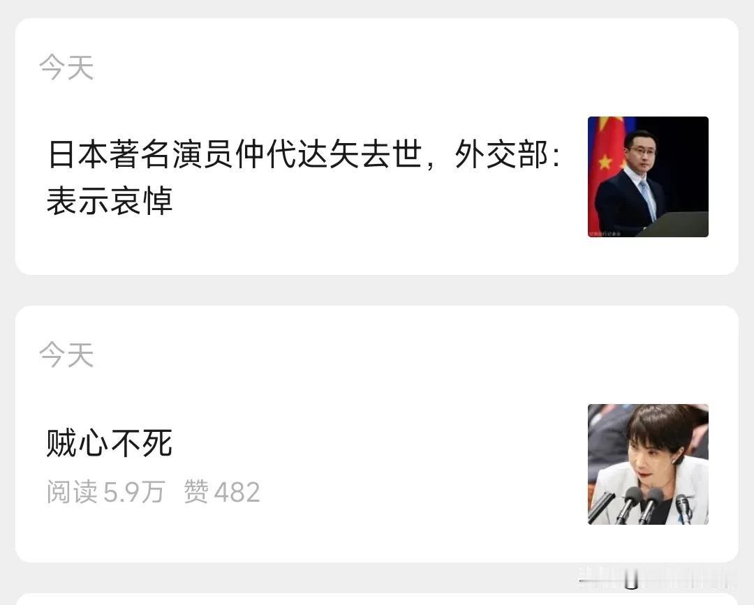 这是干嘛?一边骂高市贼心不死,一边对日本演员表示哀悼。很多网友是不是被这样的操作看傻了,其实不必大惊小怪。 这就是我们中国人的智慧,对于“妖魔鬼怪”,我们要坚决痛击之。对于爱好和平的人,我们要坚决支持。 爱憎分明,博爱友善。这恰恰是高市,川普等西方政客所缺乏的。他们应该向我们虚心请教学习。
