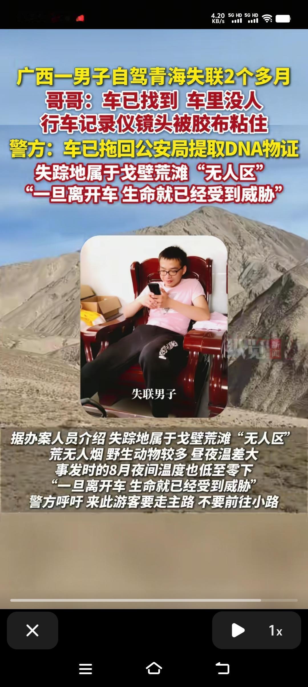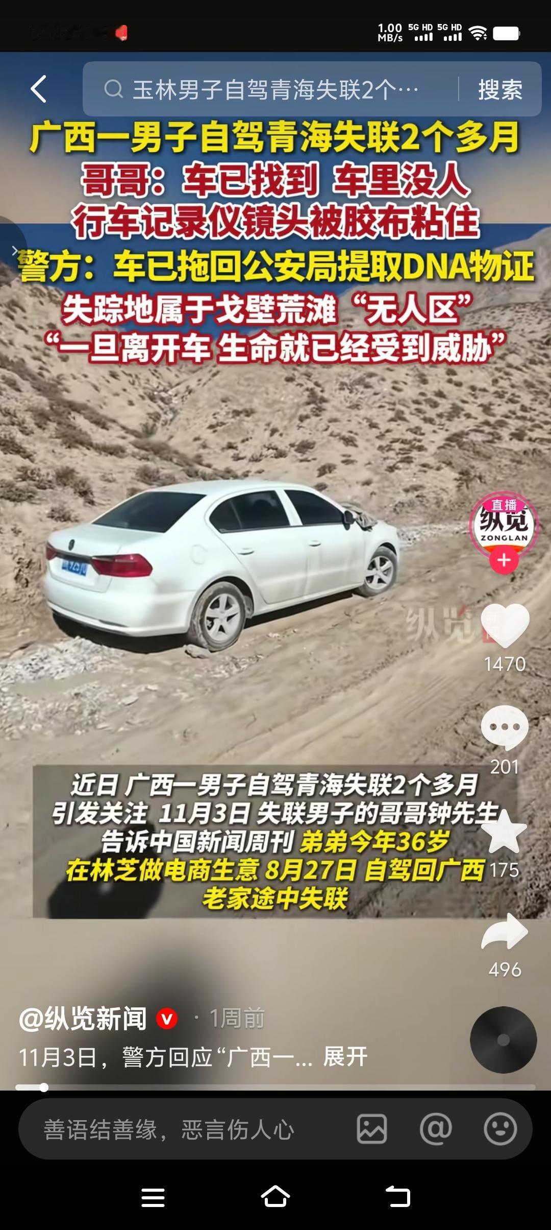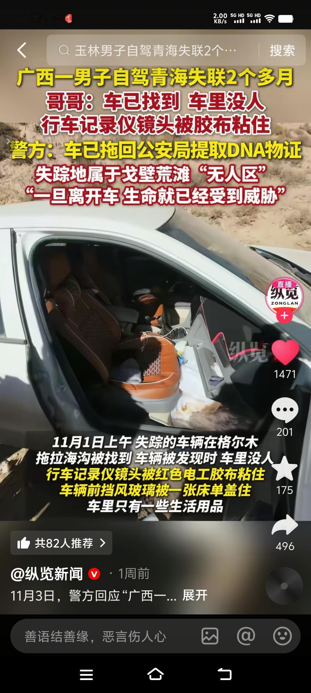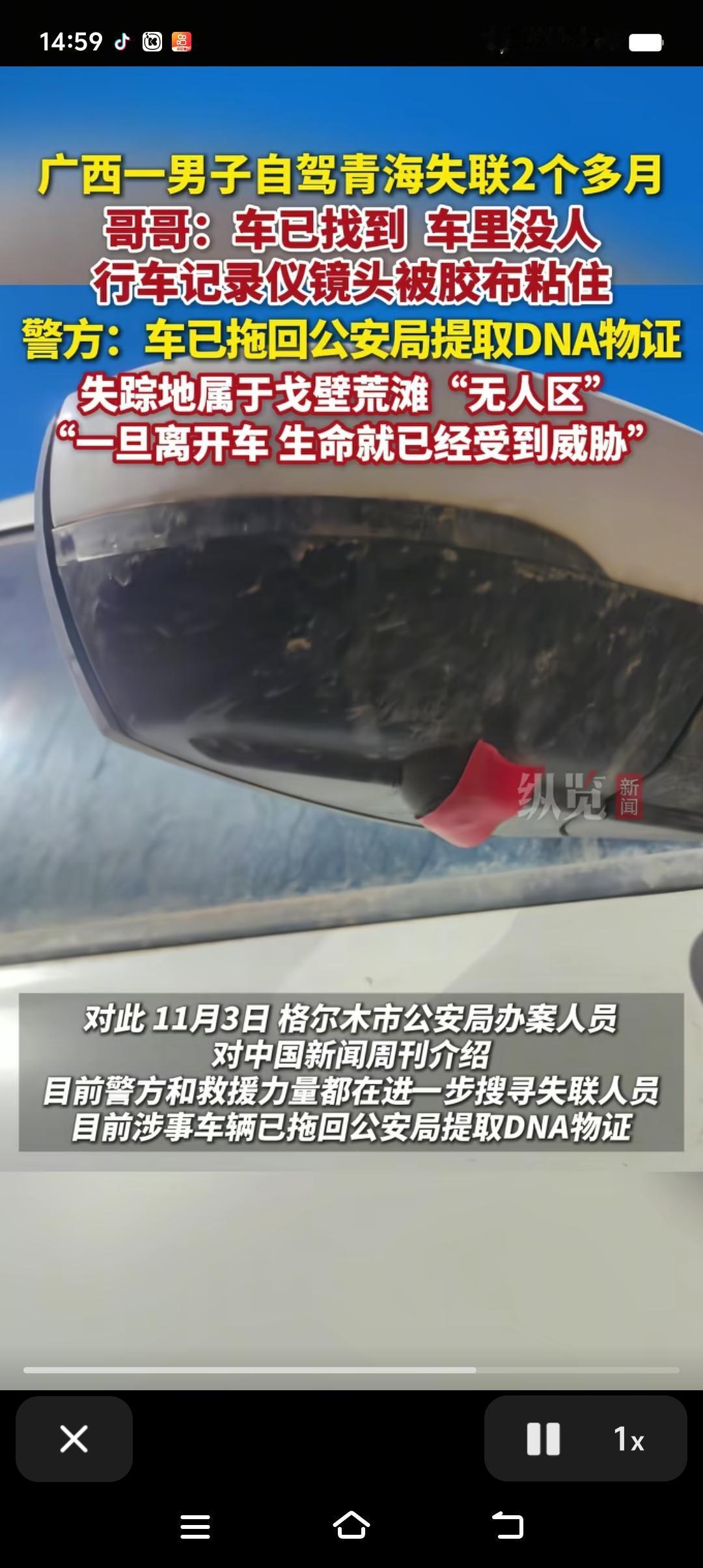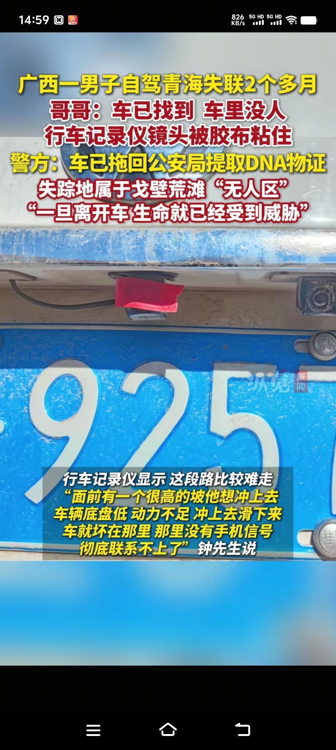 重要的事情说三遍,非必要外出尽量不外出,尤其是人烟稀少、人生地不熟的地方,能老老实实呆在家里最好。 失联72天的36岁广西男子车找到了,但人没找到。奇怪的是行车记录仪镜头被红色电工胶布粘住,车前挡玻璃被床单盖住,车内有一些生活用品,车里还有余油,手机有过短暂恢复信号,却未发出求救。种种迹象表明凶多吉少,到底是图财还是图人我们不清楚,但失联72天应该绝不是个人行为。 害人之心不可有,防人之心不可无,别以为这个社会很安全、很和谐,其实危险无处不在。
