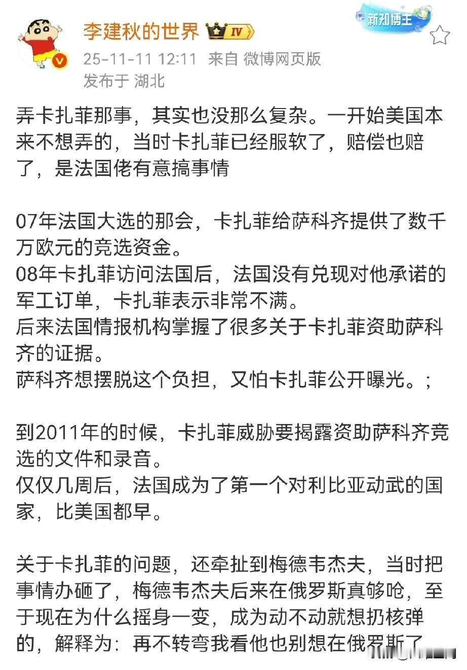 法国前总统萨科齐受贿几千万欧,判了5年,结果坐牢20天后就可以出狱了,这要是放在我们这边,公知会怎么说? 卡扎菲当年得罪的不是美国,而是萨科齐,因为卡扎菲握有萨科齐受贿的证据,因为行贿的正是卡扎菲难怪卡扎菲能在联合国这么狂,原因西方一个大国总统被他几千万欧元搞定了,所以它觉得钱可以搞定一切,所以萨科齐就公报私仇,难怪当时是美法两国的战机一同去炸卡扎菲的,后面萨科齐还是东窗事发了,被判了5年,结果做了20天牢,这也太儿戏了!难怪公知总说西方没有腐败了,那只是它们不查而已!